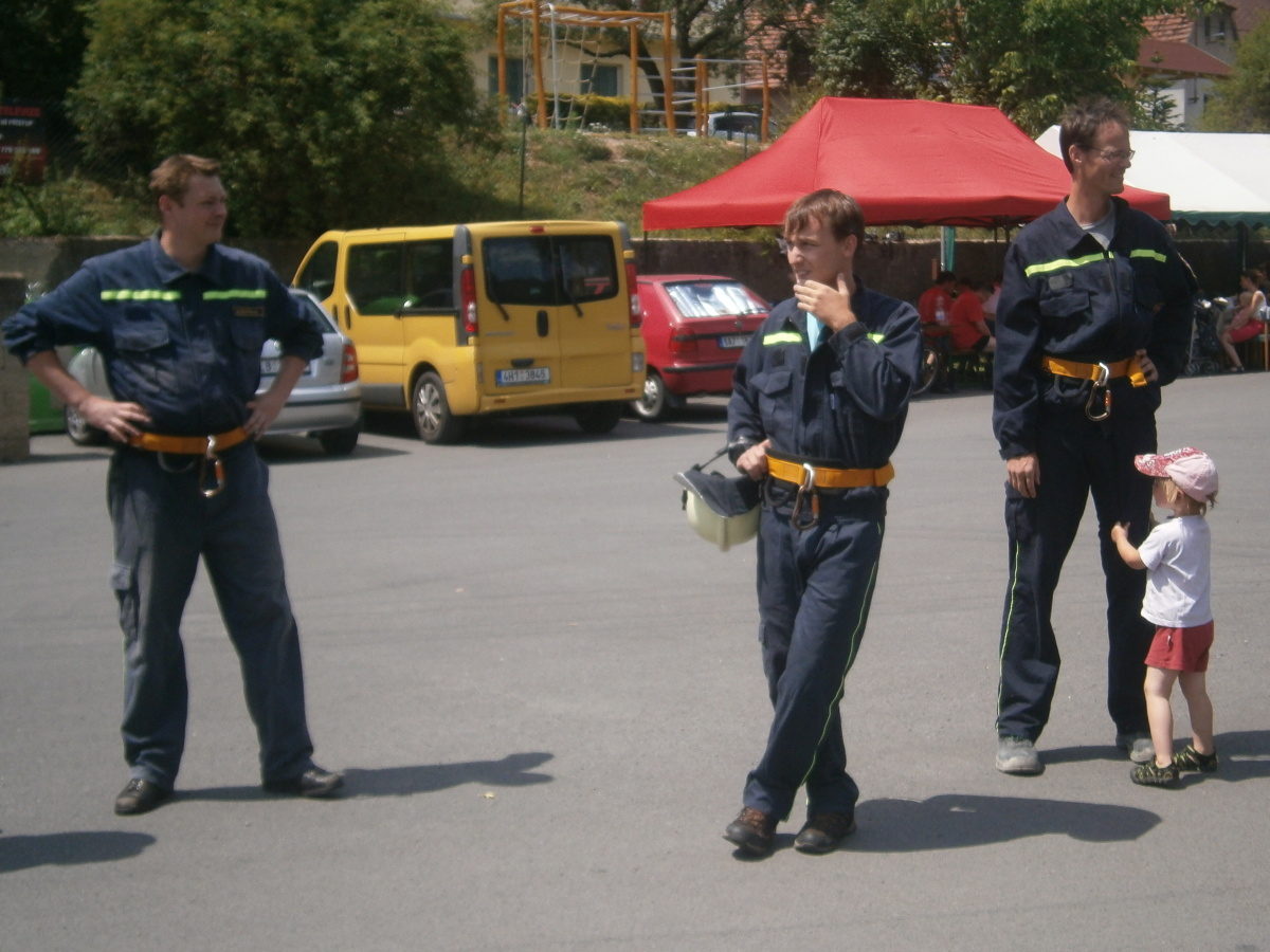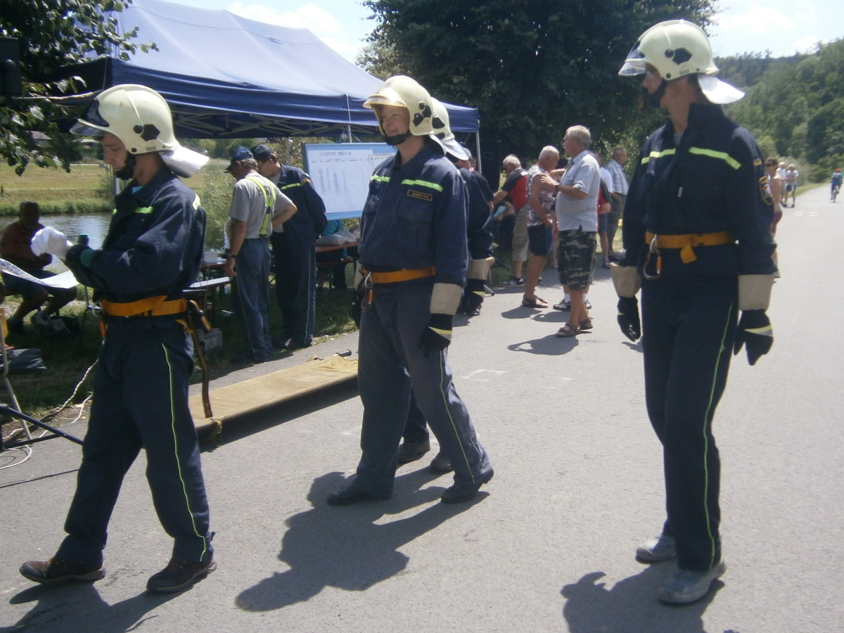 První z našeho sboru nastoupily na start ženy. Slanění z mostu proběhlo dobře, avšak s menším zdržením u Kátina uzlu. Při naloďování do raftu Míša uklouzla a sjela přímo pod něj do vody, koukala jí jen helma. Potloukla se o kameny, ale závod zkušeně dokončila. Jízda na raftu se celkem podařila. Samozřejmě nebyla podle původních představ a domluv, ale nevadí, hlavně, že byl naložen barel. U zdravovědy nebylo co vytknout. Kýble už byly opravdu dno sil, přesto je holky zvládly a za obrovské podpory fanoušků doběhly do cíle. Výsledkem bylo 2. místo za vítězkami z Broum. Kluci nastupovali na start jako poslední družstvo. Vteřiny, které ztratili při slaňování, dokázali nahnat rychlou jízdou na raftu a s přehledem naložili barel. A pak, někde mezi broděním a nošením kýblů, ztratili hodně času. Neudělali nic špatně, přesto nebyli z nejrychlejších. Možná zpomalili, možná docházeli poslední síly… Z pohledu diváka ze břehu se to radí. Jen ten, kdo tuto soutěž sám běžel, tak ví…