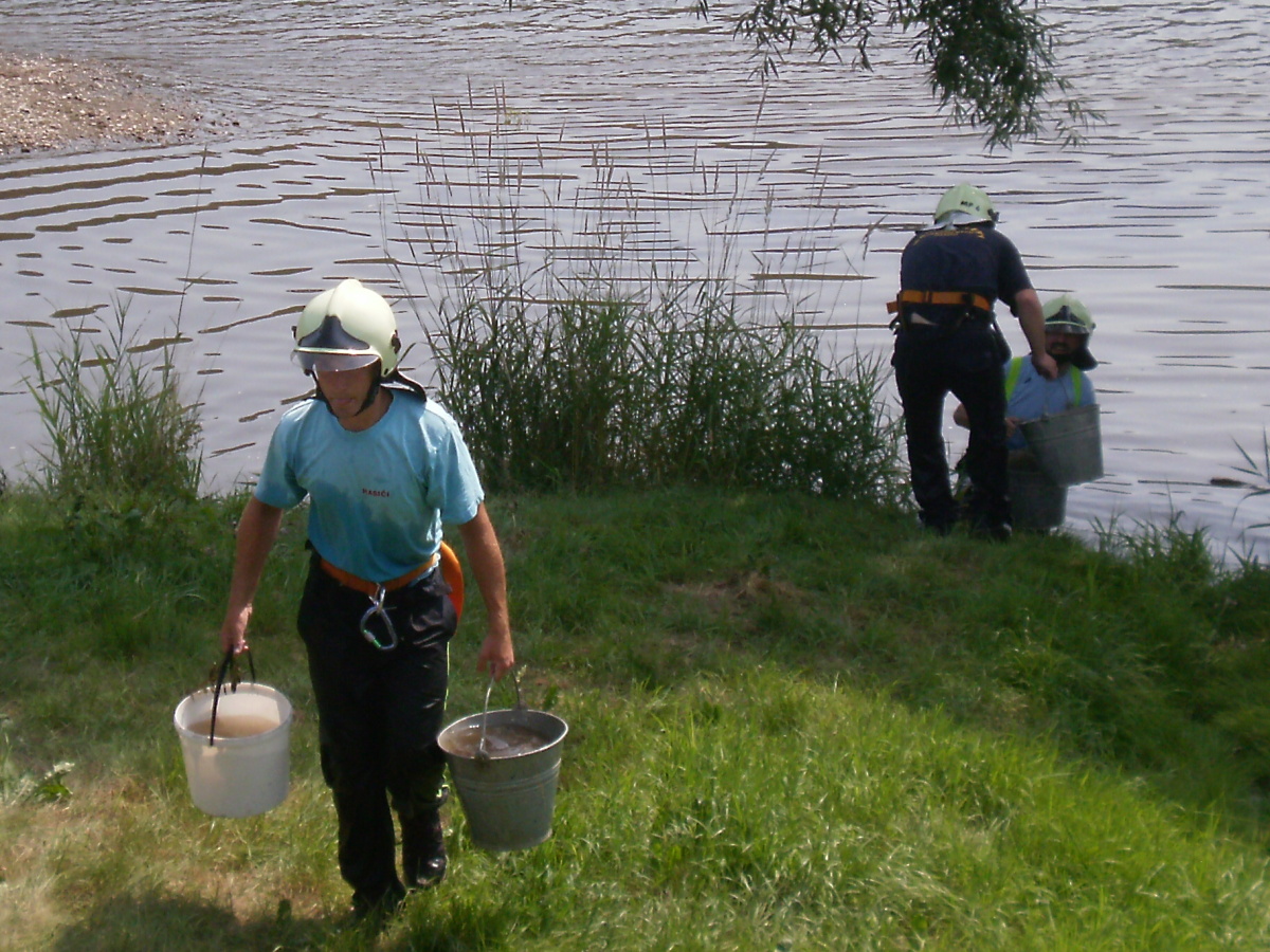 První z našeho sboru tedy nastoupily na start ženy. Slanění z mostu proběhlo velmi dobře a rychle, po přebrodění řeky na druhý břeh však došlo k menšímu zádrhelu. Do ruky se mi dostala nejmenší vesta, kterou jsem přes hrudník prostě nemohla zapnout, což při nalodění do člunu je povinnost. Míša proto musela svléknout svou vestu, abychom je mohly vyměnit. Díky této neplánované módní přehlídce jsme však ztratili min. drahocennou minutu. Jízda na raftu se nám celkem podařila, barel jsme vyzvedly a v pořádku přistály. Brodění na druhý břeh ale nebylo jednoduché, strhával nás proud, takže jsme několikrát upadly. Míša, která běžela jako úplně poslední, protože ještě vylévala barel, také spadla a vůbec se jí nedařilo zvednout. Štěstí, že se zachytla kamene, ze všech sil zabojovala a zvedla se, jinak by ji proud unášel až do Hýskova. Chvíli jsme se zdržely ještě u masáže srdce, kde Štěpka musela více zaklonit hlavu figuríny a opakovat dýchání. Doběh s nosítky do cíle už byl bez problémů. Výsledkem bylo 3. místo s časem 11:07:34 min.
