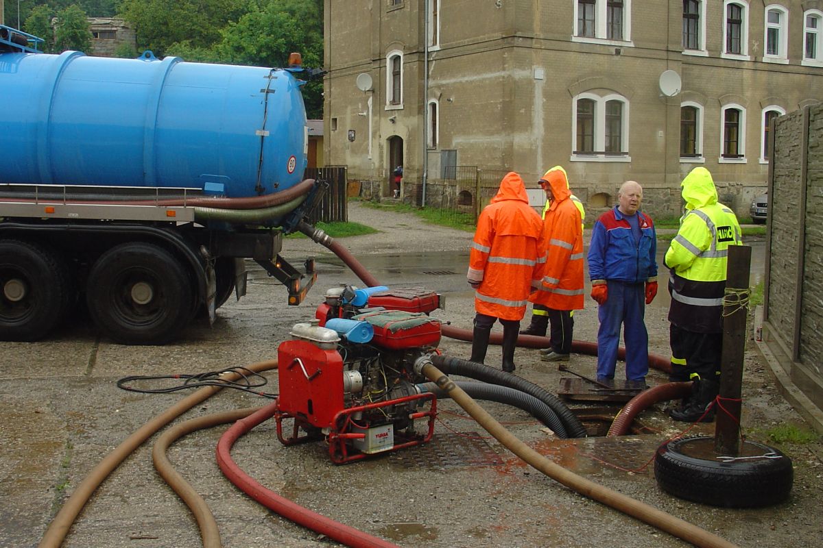 Pomoc při povodních 3.6.2013 - čerpání kanalizace v Hýskově