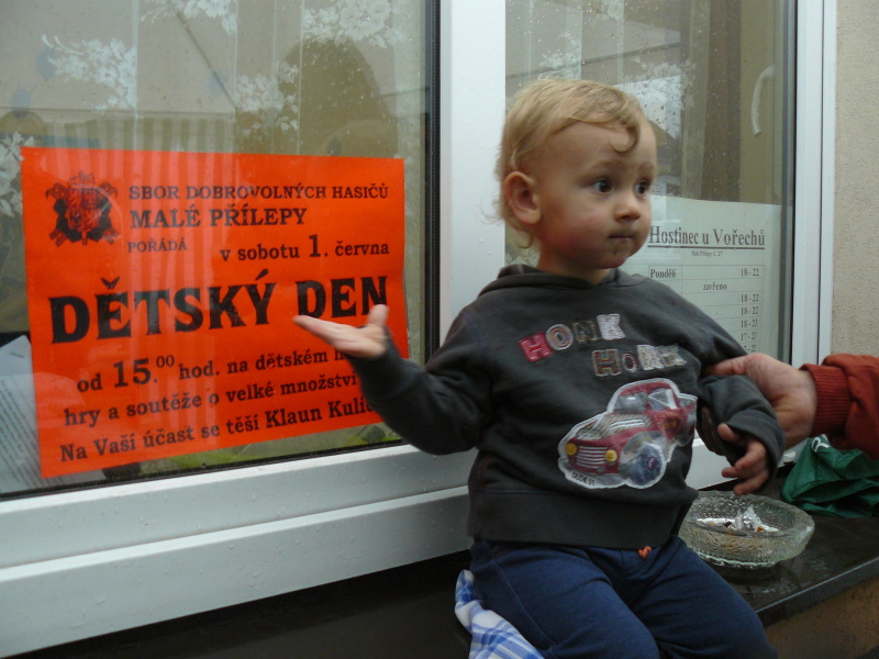 Proto si připomeňme, i jak se u nás bavili ti nejmladší. Ano, opět jsme uspořádali Dětský den. Pršelo, tak byl na sále u Vořechů a vůbec to nevadilo! A zde máme, vážení čtenáři našich stránek - pro velký úspěch - další, druhou kontaktní otázku: Komu je podobné děcko na skupinovém fotu před hostincem? Nápověda: má přezdívku Malý Chovatel. Kdo z účastníků kvízu bude odměněm tentokrát, se rozhodne do konce prázdnin.