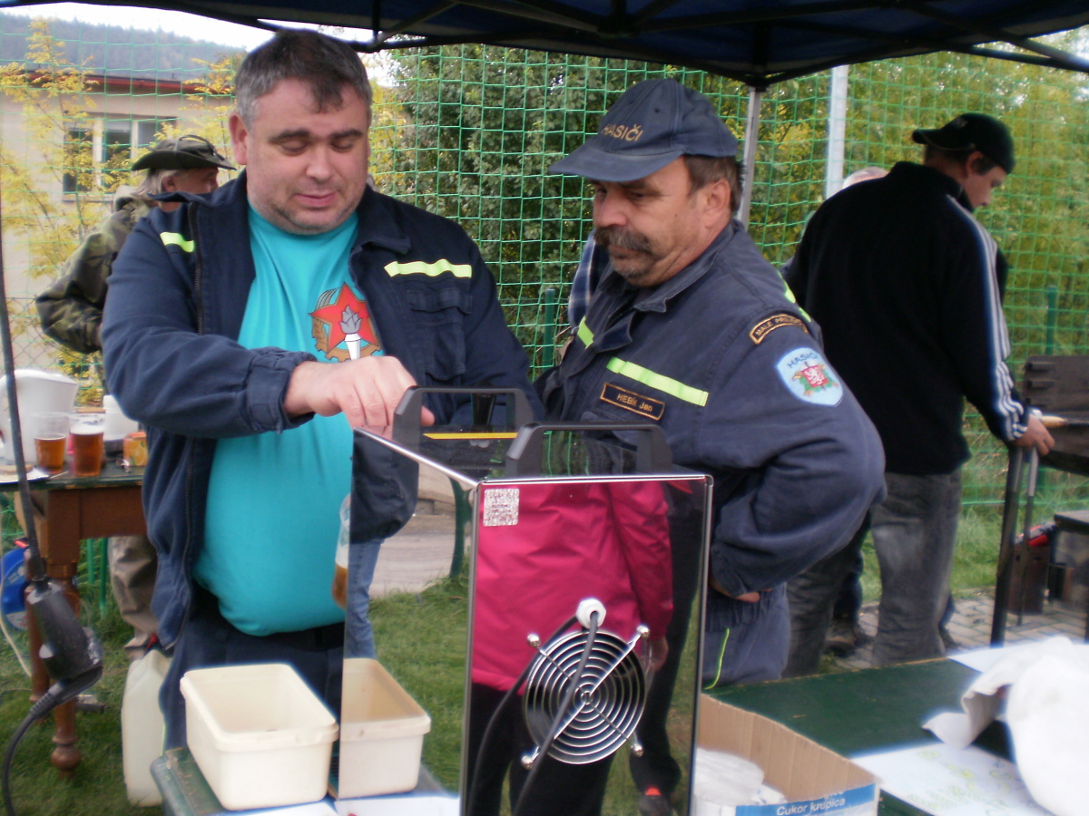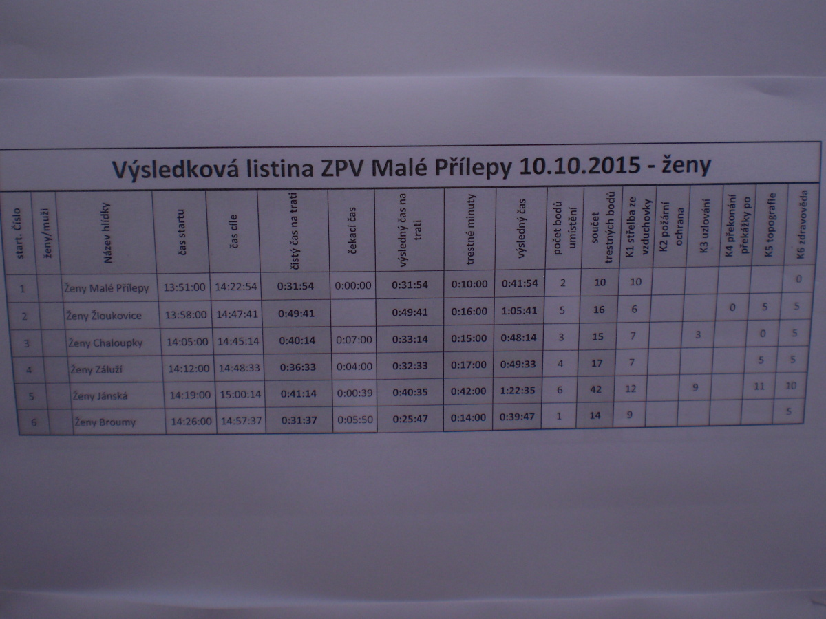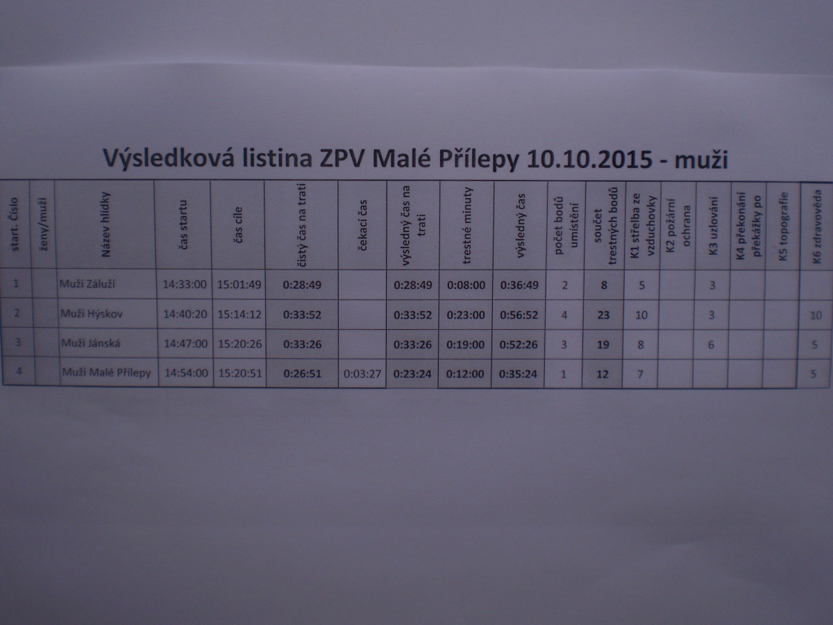 Kluci se ještě minulý týden snažili poskládat dvě družstva, ale bohužel marně, na trať vyběhlo pouze jedno. Holkám vypomohl Pavel, který se okamžitě jmenoval velitelem družstva a rozděloval taktické pokyny. Nebyl by to on, kdyby si pro všechny přítomné, a pro své družstvo obzvlášť, něco nepřipravil. Ve snaze povzbudit holky ve střelbě si připravil kratší scénku na motiv nám všem tolik známých Mayovek. Nevím, zda se holky zvuku věhlasné opakovačky henryovky spíše nezalekly, protože právě střelba je značně potrápila. Ostatní úkoly splnily bravurně, bez trestných bodů. Rovněž i mladí přílepští hasiči pokazili pouze střelbu. Kluci také chybovali při střelbě a dokonce i tam, kde to snad nikdo nečekal – na stanovišti zdravovědy při obvazu kolena.