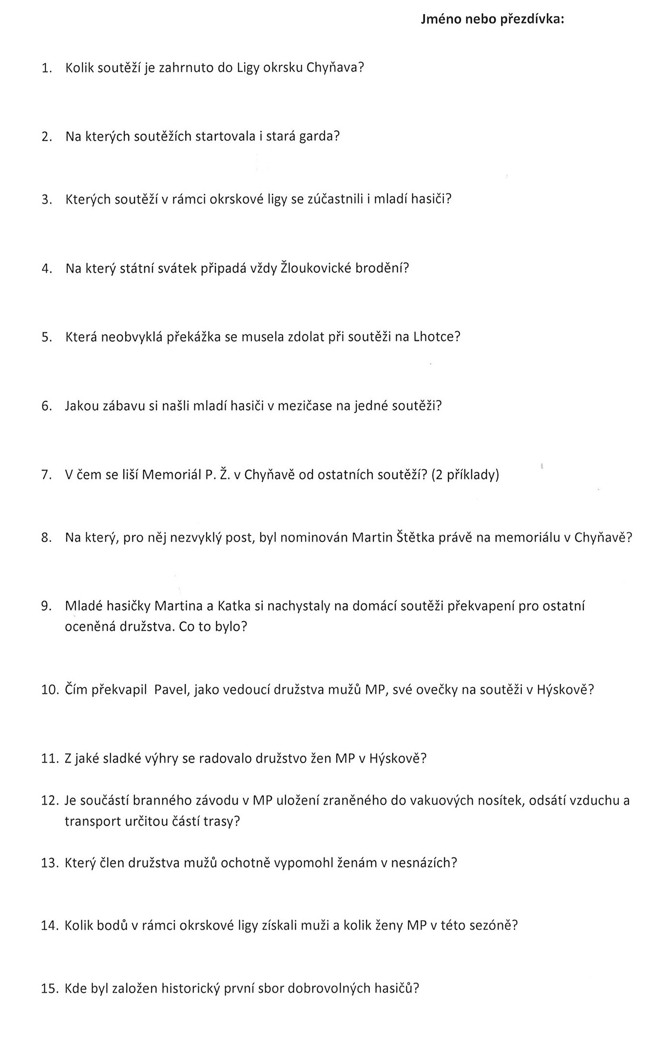 Posezení bylo zpestřeno soutěží formou testu, který bych nazvala „Střípky z hasičských soutěží, aneb co si (ne)pamatujeme“. Při některých odpovědích, následném vyhodnocení a předávání cen, jsme se vskutku pobavili.
