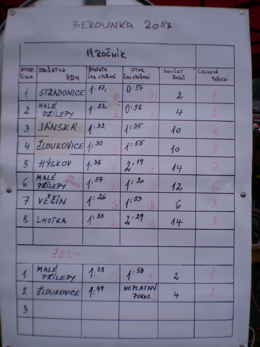 Ženy se umístily na 1. místě ze dvou zúčastněných družstev. Muži ml. brali 2. místo za domácími Stradonicemi a muži st. svým 6. místem předčili i mladší družstva.