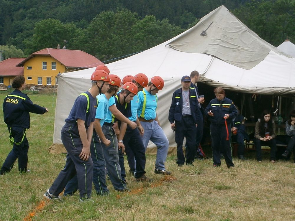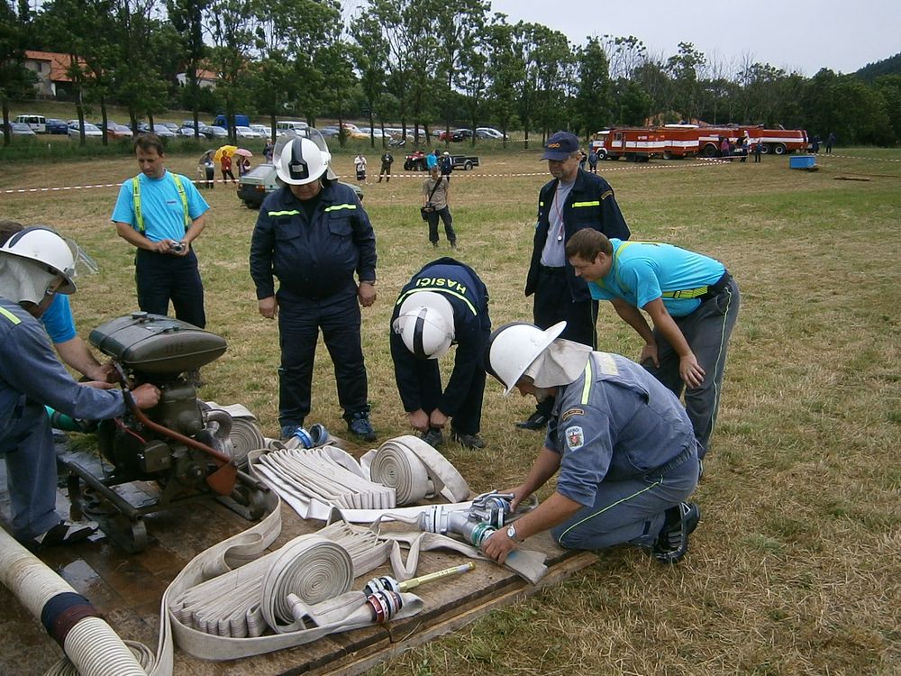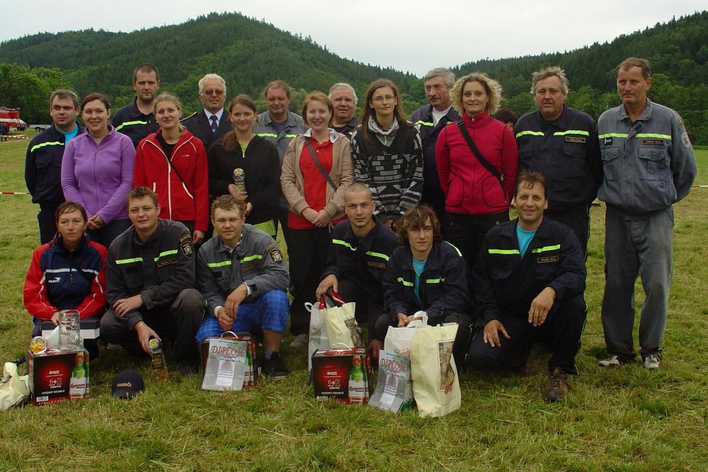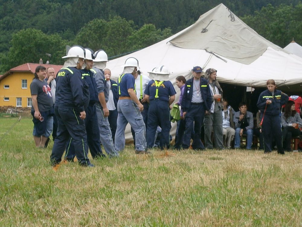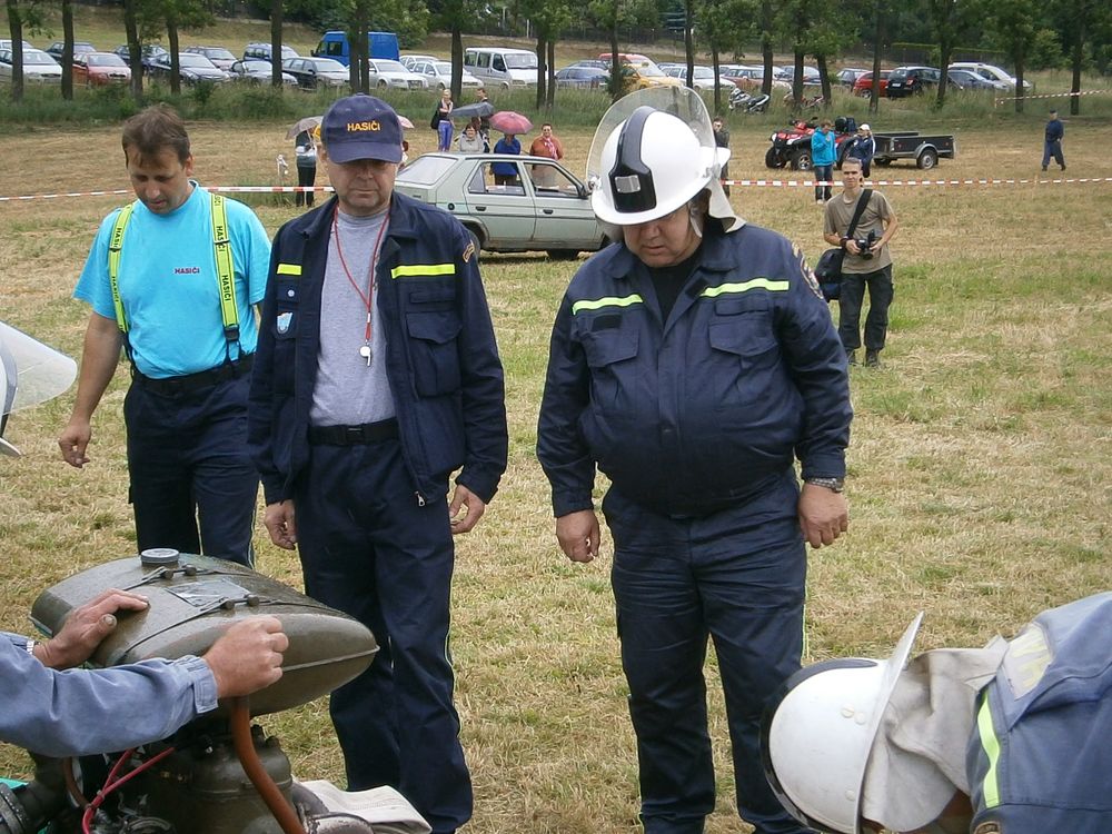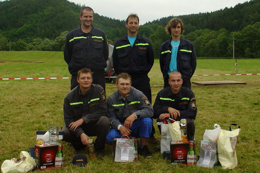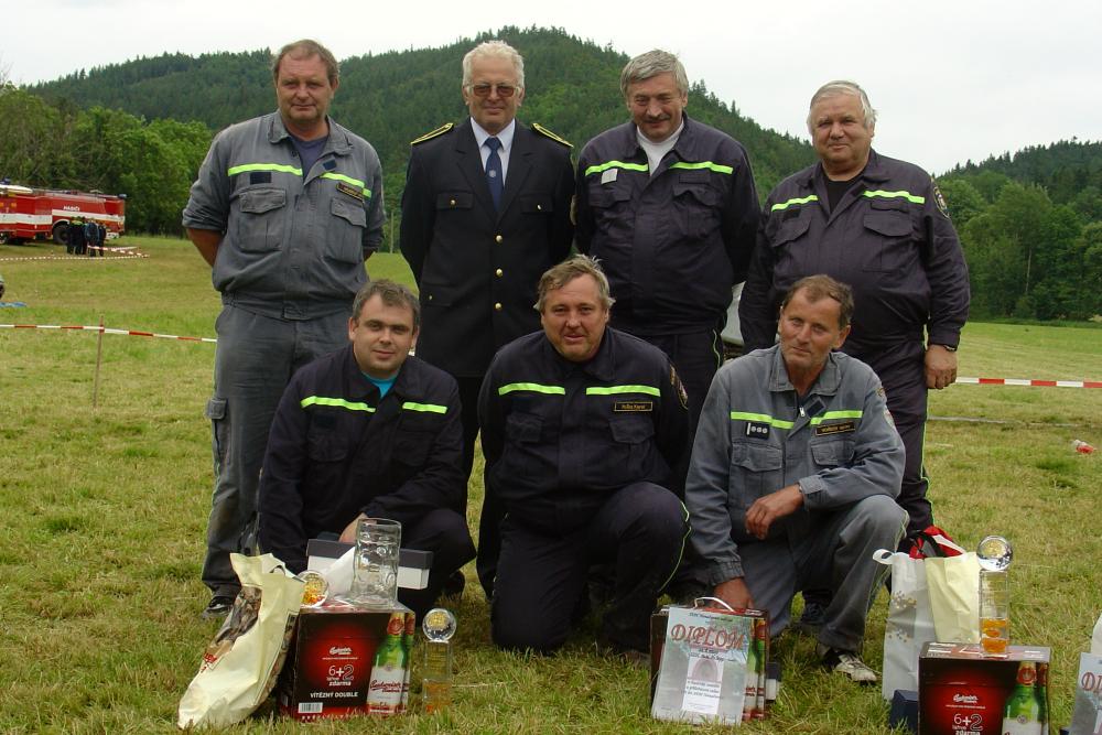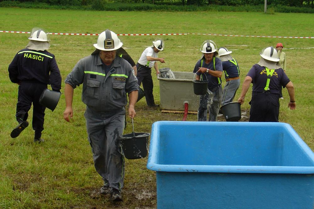družstvo za úkol odtlačit do vzálenosti 60-ti metrů osobní automobil Škoda Favorit a poté pomocí kbelíků nosit vodu z jedné nádoby do druhé. Do soutěže náš sbor tentokrát vyslal hned tři družstva, a to ženské, mužské družstvo tzv. juniorů a mužské družstvo tzv. seniorů, nebo chcete-li veteránů. Zejména posledně zmiňované družstvo budilo hned od svého příjezdu obrovský zájem hlavně mezi fotografy a zástupci médií. Pravděpodobně za tím stály jejich vypracované postavy, které několik desítek let budovali při různých hasičských soutěžích, ale i jiných kulturních akcích. Tito zkušení harcovníci začali sbírat ocenění již před začátkem soutěže. Jako bezkonkurenčně nejtěžší družstvo ( součet činil 704 kg ) a nejstarší družstvo ( součet činil 374 let ) se po hlavě vrhli do soutěžení s o generaci mladšími závodníky. Jako první z našeho sboru do soutěže zasáhlo družstvo mladších, které bez chyby splnilo disciplínu požárního útoku s PS 8 a s časem 30,04 sec. se dostalo do čela soutěže. Jako další přišli na řadu starší. Se slovy košíkáře týmu: "Já ho tam namotám ( myšleno koš na savici ) a mlaďasy spráskáme jako psi" se vrhli na požární útok. Pravděpodobně zasáhla nervozita a právě na koši došlo k menšímu zádrhelu, který připravil "veterány" o lepší čas. I přesto je čas 46,50 sec. vzhledem k jejich tělesným proporcím skvělým výsledkem. Takže pánové klobouk dolů. Jako poslední pak k disciplíně požarní útok nastupovala naše děvčata. Po bezchybně a precizně provedené disciplíně se čas zastavil na hodnotě 31,52 sec. Tímto skvělým časem za sebou nechala i většinu mužských družstev. Po krátké pauze následovala štafeta. Jako první opět nastoupilo družstvo mladších, které časem 1,08 min. ovládlo i tuto část soutěže. Po nich přišla na řadu znovu stará garda, která se mezitím již stačila vzpamatovat a vydýchat z předchozí disciplíny. Všichni podali výkon na hranici svých možností a s časem 1,16 min. se umístili uprostřed startovního pole. Na závěr soutěže nastoupila ke štafetě i děvčata, která s časem 1,30 min. obsadila druhé místo. Po skončení soutěže následovala ukázka vyproštění zraněné osoby z havarovaného vozidla a poté již došlo na vyhlášení. Celý program byl zakončen taneční zábavou pod širým nebem, ze kterého občas spadla nějaká ta dešťová kapka, ale ani tato skutečnost nemohla pokazit radost nad našimi dosaženými výsledky.