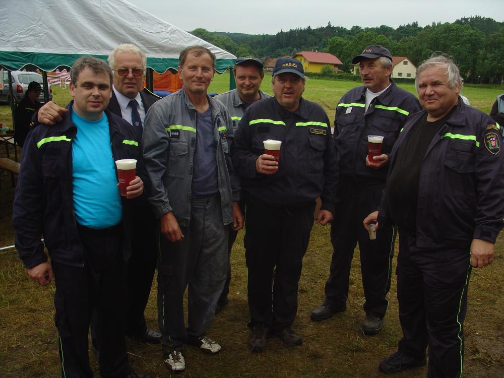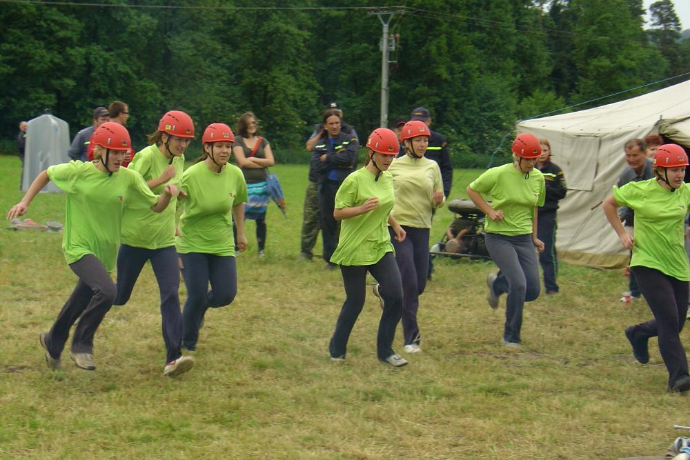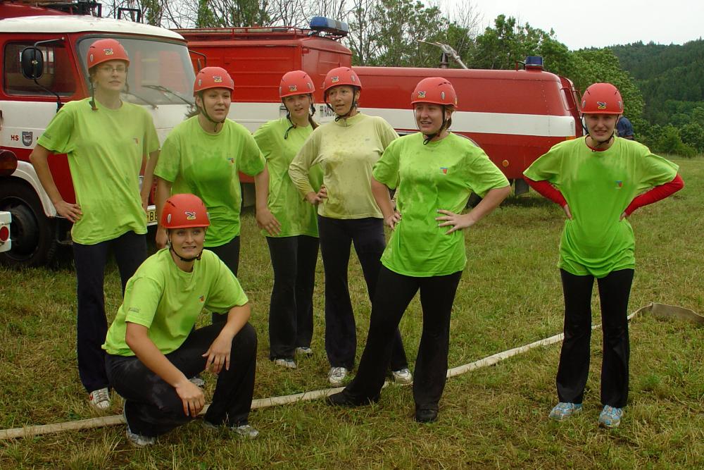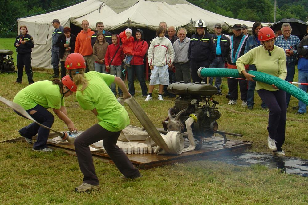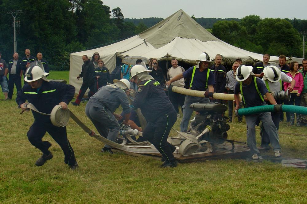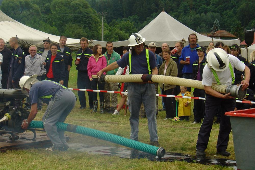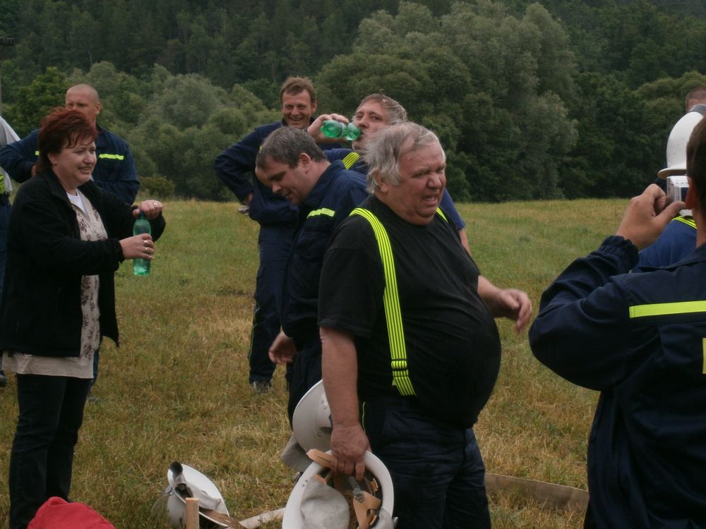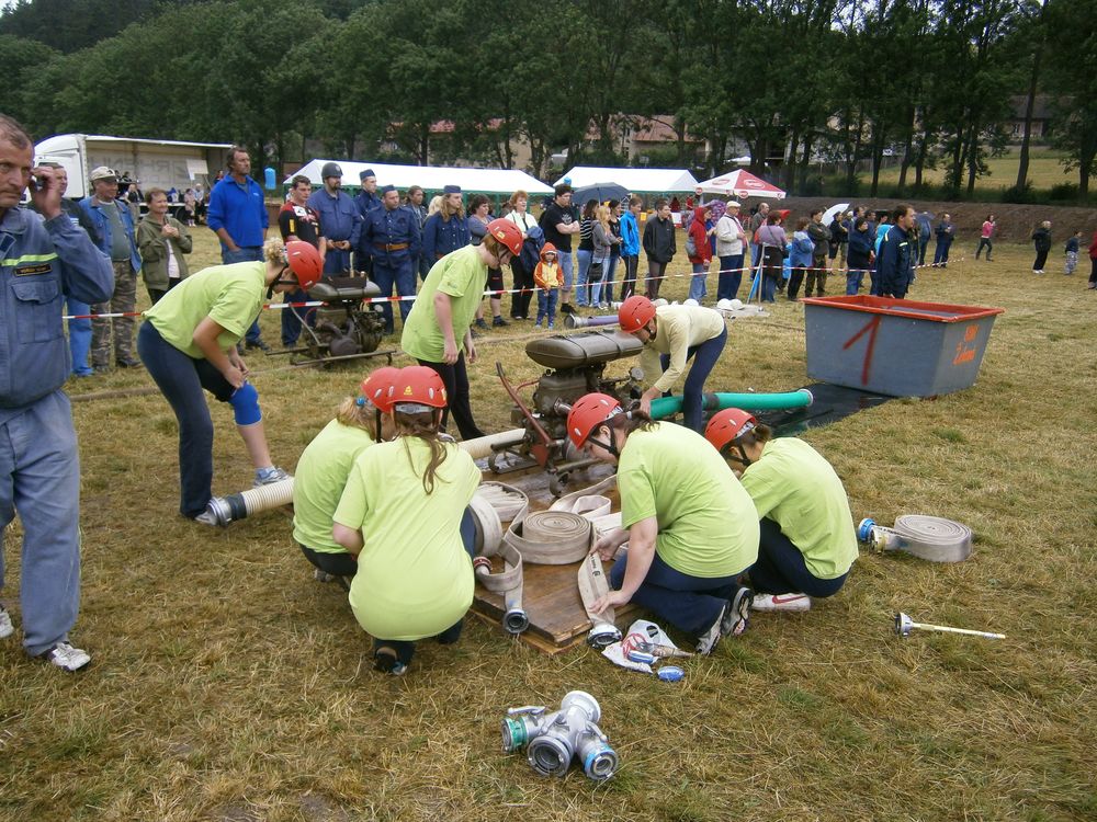 družstvo za úkol odtlačit do vzálenosti 60-ti metrů osobní automobil Škoda Favorit a poté pomocí kbelíků nosit vodu z jedné nádoby do druhé. Do soutěže náš sbor tentokrát vyslal hned tři družstva, a to ženské, mužské družstvo tzv. juniorů a mužské družstvo tzv. seniorů, nebo chcete-li veteránů. Zejména posledně zmiňované družstvo budilo hned od svého příjezdu obrovský zájem hlavně mezi fotografy a zástupci médií. Pravděpodobně za tím stály jejich vypracované postavy, které několik desítek let budovali při různých hasičských soutěžích, ale i jiných kulturních akcích. Tito zkušení harcovníci začali sbírat ocenění již před začátkem soutěže. Jako bezkonkurenčně nejtěžší družstvo ( součet činil 704 kg ) a nejstarší družstvo ( součet činil 374 let ) se po hlavě vrhli do soutěžení s o generaci mladšími závodníky. Jako první z našeho sboru do soutěže zasáhlo družstvo mladších, které bez chyby splnilo disciplínu požárního útoku s PS 8 a s časem 30,04 sec. se dostalo do čela soutěže. Jako další přišli na řadu starší. Se slovy košíkáře týmu: "Já ho tam namotám ( myšleno koš na savici ) a mlaďasy spráskáme jako psi" se vrhli na požární útok. Pravděpodobně zasáhla nervozita a právě na koši došlo k menšímu zádrhelu, který připravil "veterány" o lepší čas. I přesto je čas 46,50 sec. vzhledem k jejich tělesným proporcím skvělým výsledkem. Takže pánové klobouk dolů. Jako poslední pak k disciplíně požarní útok nastupovala naše děvčata. Po bezchybně a precizně provedené disciplíně se čas zastavil na hodnotě 31,52 sec. Tímto skvělým časem za sebou nechala i většinu mužských družstev. Po krátké pauze následovala štafeta. Jako první opět nastoupilo družstvo mladších, které časem 1,08 min. ovládlo i tuto část soutěže. Po nich přišla na řadu znovu stará garda, která se mezitím již stačila vzpamatovat a vydýchat z předchozí disciplíny. Všichni podali výkon na hranici svých možností a s časem 1,16 min. se umístili uprostřed startovního pole. Na závěr soutěže nastoupila ke štafetě i děvčata, která s časem 1,30 min. obsadila druhé místo. Po skončení soutěže následovala ukázka vyproštění zraněné osoby z havarovaného vozidla a poté již došlo na vyhlášení. Celý program byl zakončen taneční zábavou pod širým nebem, ze kterého občas spadla nějaká ta dešťová kapka, ale ani tato skutečnost nemohla pokazit radost nad našimi dosaženými výsledky.