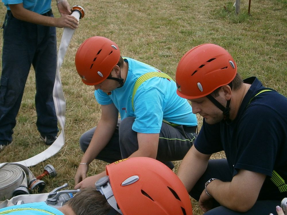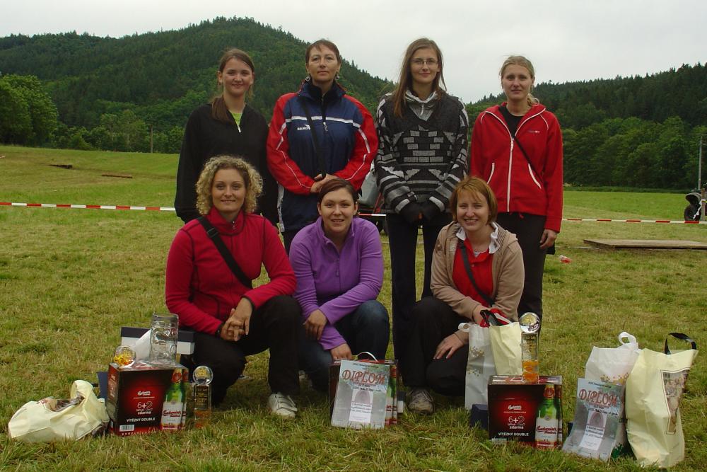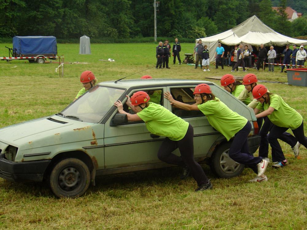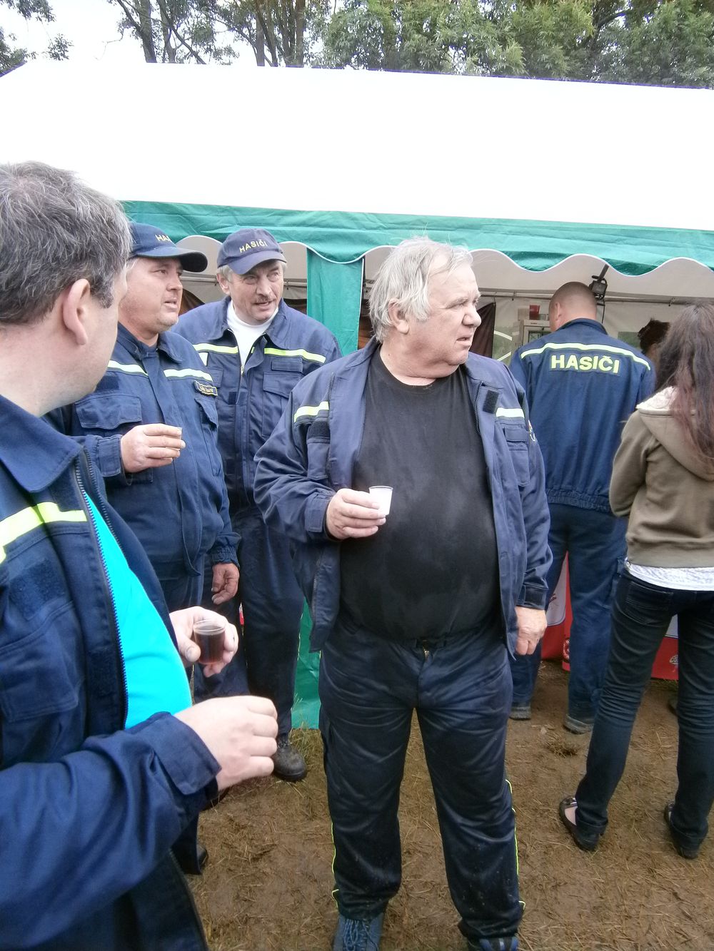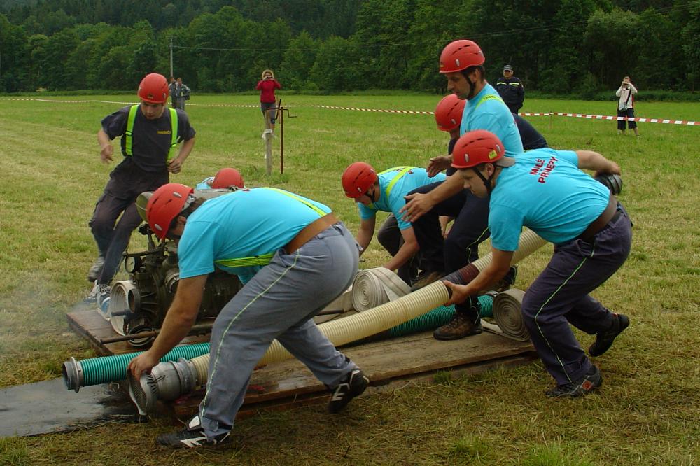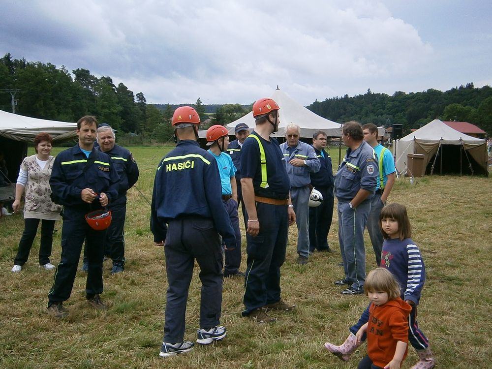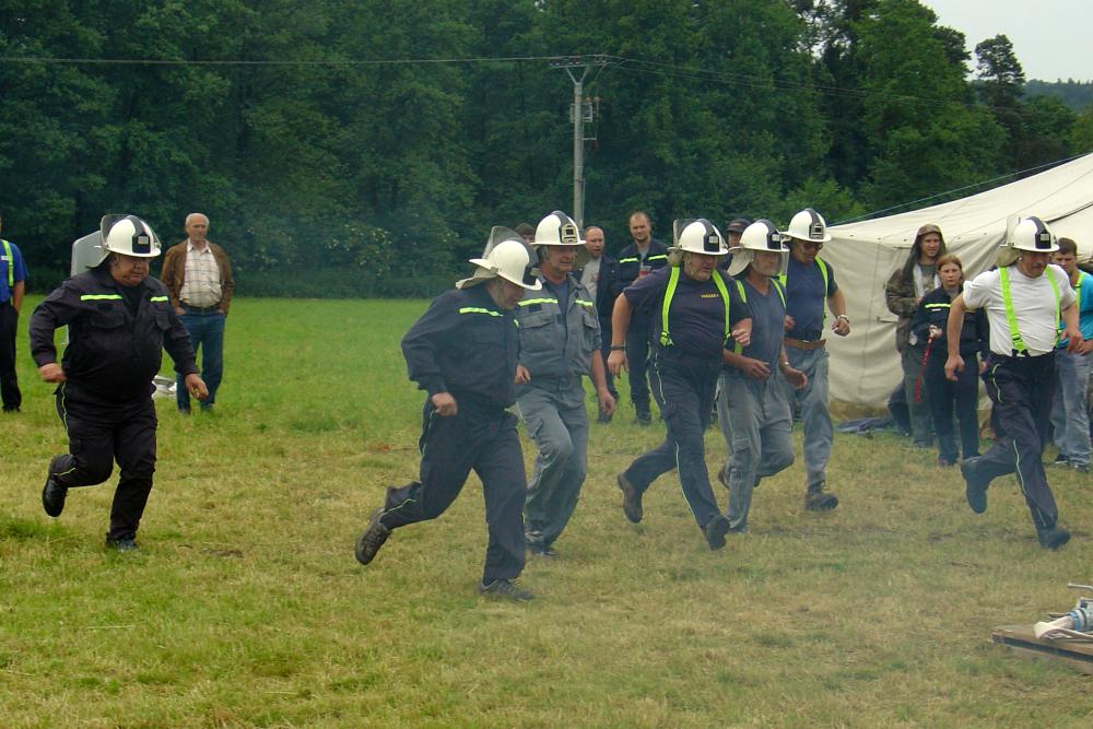družstvo za úkol odtlačit do vzálenosti 60-ti metrů osobní automobil Škoda Favorit a poté pomocí kbelíků nosit vodu z jedné nádoby do druhé. Do soutěže náš sbor tentokrát vyslal hned tři družstva, a to ženské, mužské družstvo tzv. juniorů a mužské družstvo tzv. seniorů, nebo chcete-li veteránů. Zejména posledně zmiňované družstvo budilo hned od svého příjezdu obrovský zájem hlavně mezi fotografy a zástupci médií. Pravděpodobně za tím stály jejich vypracované postavy, které několik desítek let budovali při různých hasičských soutěžích, ale i jiných kulturních akcích. Tito zkušení harcovníci začali sbírat ocenění již před začátkem soutěže. Jako bezkonkurenčně nejtěžší družstvo ( součet činil 704 kg ) a nejstarší družstvo ( součet činil 374 let ) se po hlavě vrhli do soutěžení s o generaci mladšími závodníky. Jako první z našeho sboru do soutěže zasáhlo družstvo mladších, které bez chyby splnilo disciplínu požárního útoku s PS 8 a s časem 30,04 sec. se dostalo do čela soutěže. Jako další přišli na řadu starší. Se slovy košíkáře týmu: "Já ho tam namotám ( myšleno koš na savici ) a mlaďasy spráskáme jako psi" se vrhli na požární útok. Pravděpodobně zasáhla nervozita a právě na koši došlo k menšímu zádrhelu, který připravil "veterány" o lepší čas. I přesto je čas 46,50 sec. vzhledem k jejich tělesným proporcím skvělým výsledkem. Takže pánové klobouk dolů. Jako poslední pak k disciplíně požarní útok nastupovala naše děvčata. Po bezchybně a precizně provedené disciplíně se čas zastavil na hodnotě 31,52 sec. Tímto skvělým časem za sebou nechala i většinu mužských družstev. Po krátké pauze následovala štafeta. Jako první opět nastoupilo družstvo mladších, které časem 1,08 min. ovládlo i tuto část soutěže. Po nich přišla na řadu znovu stará garda, která se mezitím již stačila vzpamatovat a vydýchat z předchozí disciplíny. Všichni podali výkon na hranici svých možností a s časem 1,16 min. se umístili uprostřed startovního pole. Na závěr soutěže nastoupila ke štafetě i děvčata, která s časem 1,30 min. obsadila druhé místo. Po skončení soutěže následovala ukázka vyproštění zraněné osoby z havarovaného vozidla a poté již došlo na vyhlášení. Celý program byl zakončen taneční zábavou pod širým nebem, ze kterého občas spadla nějaká ta dešťová kapka, ale ani tato skutečnost nemohla pokazit radost nad našimi dosaženými výsledky.