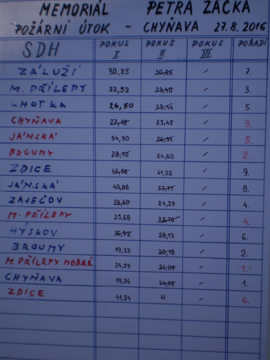 Memoriál v Chyňavě se trochu liší od ostatních soutěží. Neběhá se štafeta, soutěží se pouze v útocích. Každé družstvo má dva pokusy a počítá se lepší čas útoku. Na úvodním nástupu se sešlo celkem 15 družstev – 9 mužských a 6 ženských.