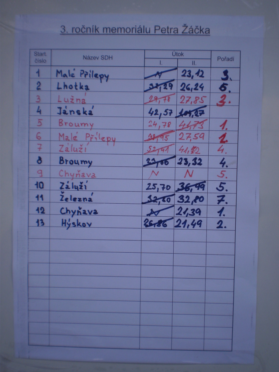 Memoriál v Chyňavě se trochu liší od ostatních soutěží. Neběhá se štafeta, soutěží se pouze v útocích a každé družstvo má dva pokusy. Netradiční je také start. Startovní čára je umístěna přímo v dráze, proti platu (ne z boku). Materiál na základně musí být tedy poskládán úplně jinak. I když jsme o této skutečnosti věděli, přesto jsme všichni přemýšleli, co s tím…. Ale poradili jsme si, zvládnout se to prostě dá :-)