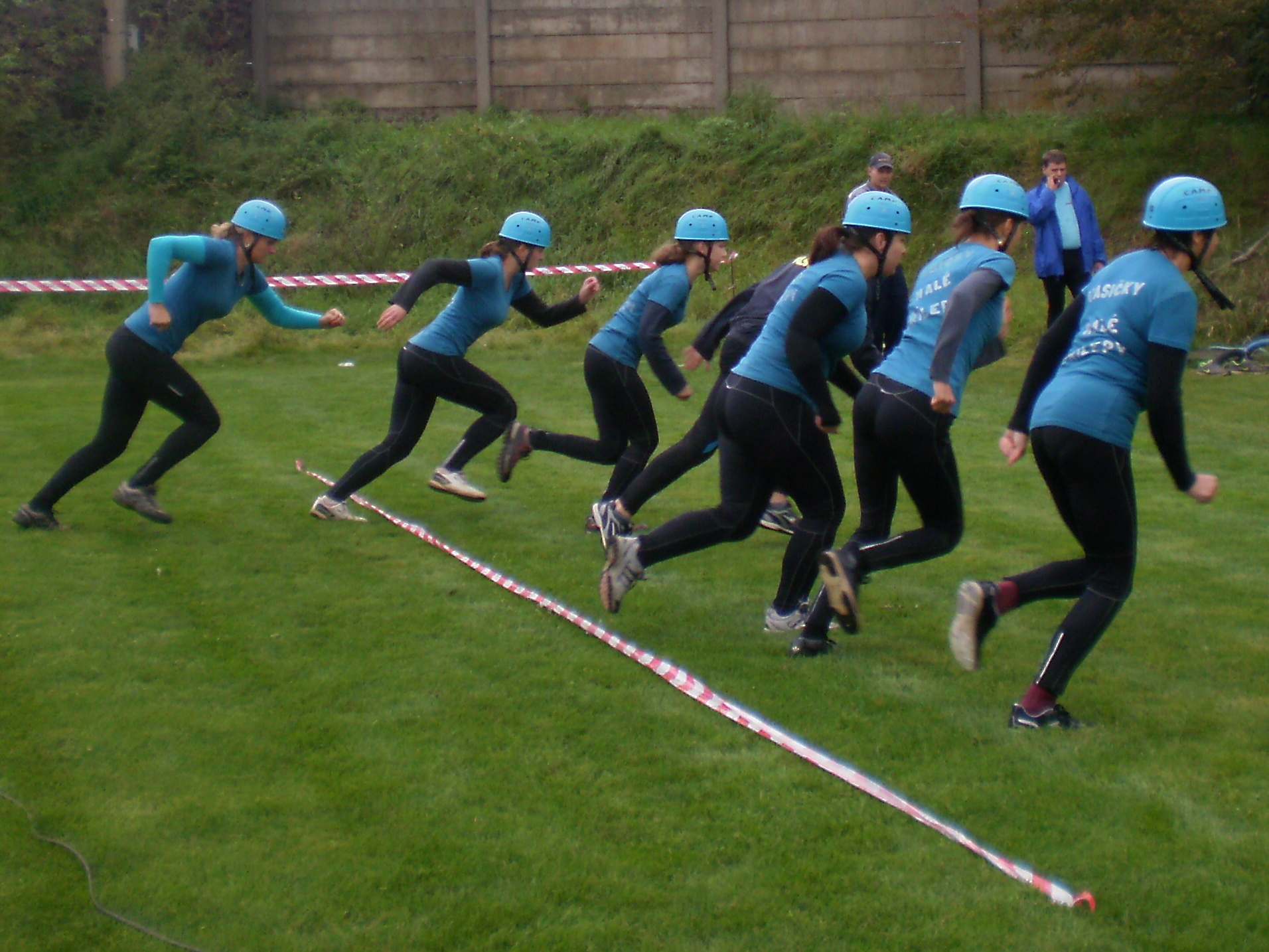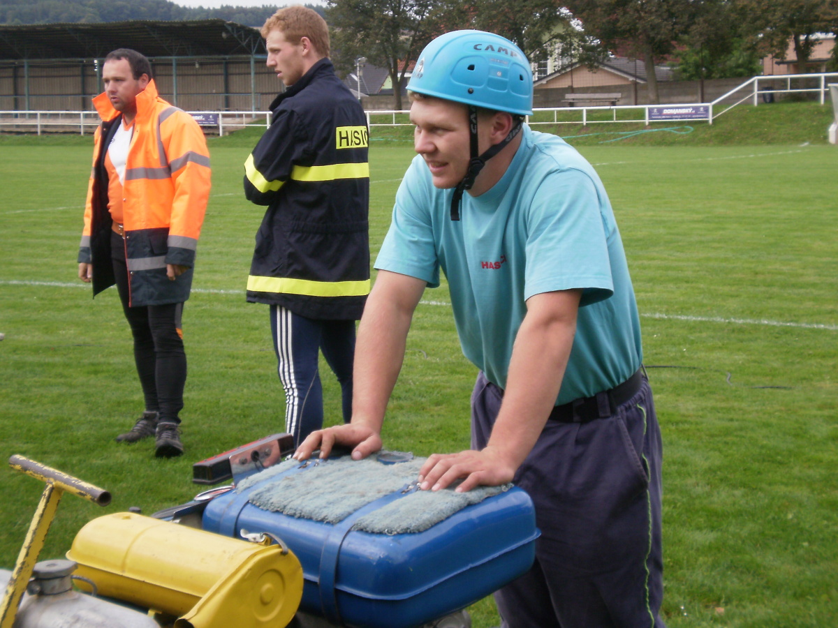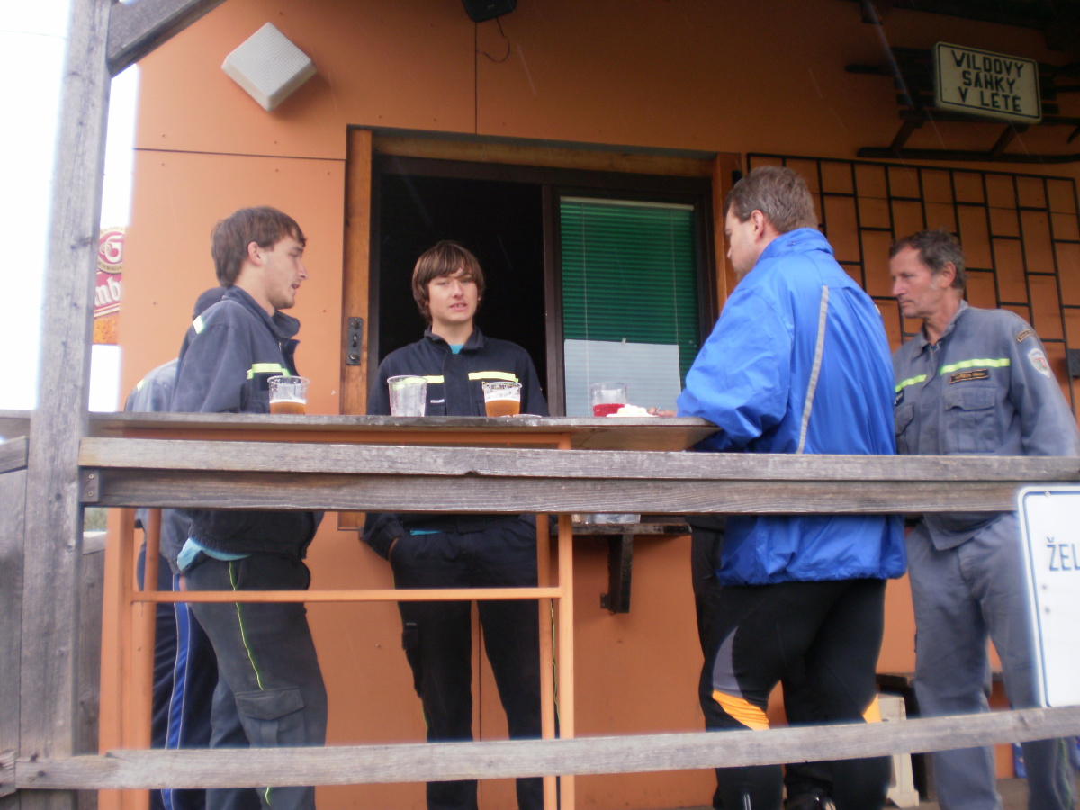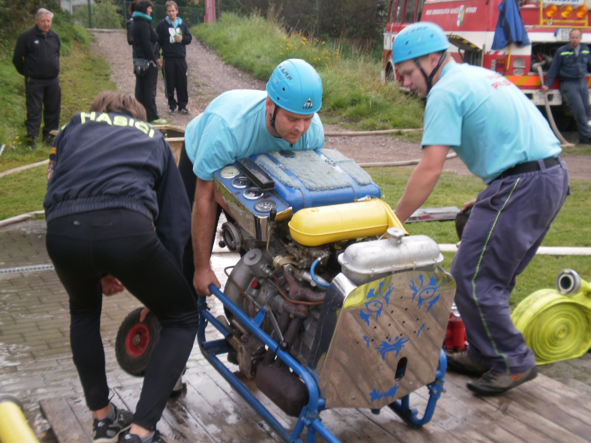 Muži opět sáhli do své záložní řady a na pomoc povolali i své „Štístko“, a tak Jára dorazil se slovy: „A co mám jako dělat?“ Útok odstartovali pěkně, parádně nabrali, ale….Pavel se chtěl zřejmě stát nerychlejším proudařem soutěže, vyběhl obrovskou rychlostí, ale bez spojených céček. Všichni na něj křičeli, až nakonec zastavil, spojil céčka a doběhl k terči. Tímto zdržením se časomíra zastavila na čase 35,17 s.