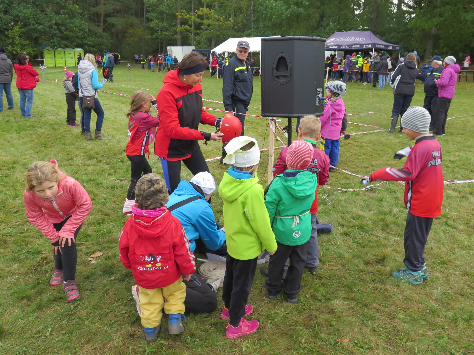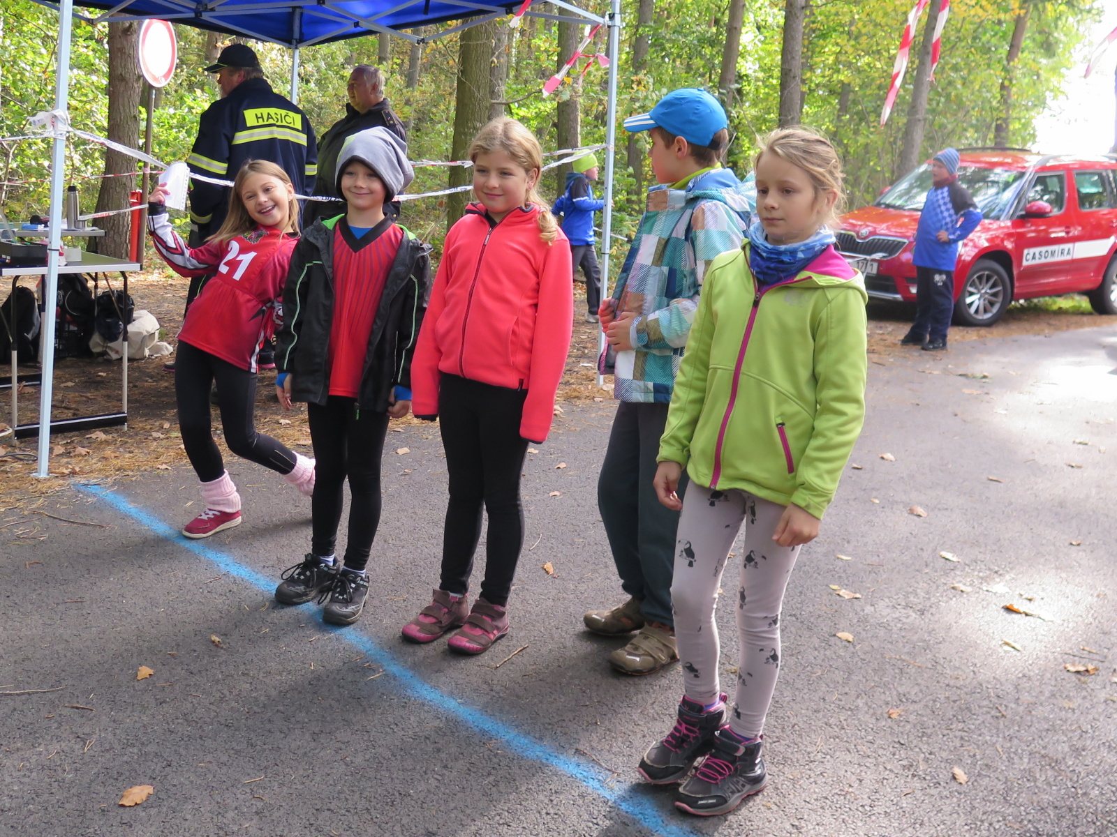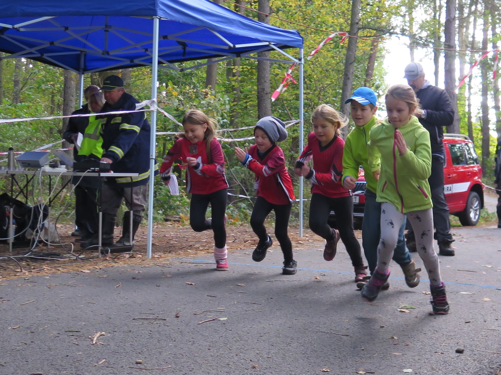 Jeli osobními auty, takže kromě Pepíka a Michala, ještě zajistil dopravu Honza Kuncl s Veronikou Brabcovou a další auto brala Verča Jedličková. Na místě jsme postavili stan, takže jsme mohli být alespoň trochu schování před větrem. Naše přípravka (historicky první účast naší přípravky na soutěži Plamen) měla startovní číslo 1 a tak startovala jako první v sestavě Ondra Bartoš, Jenda Kuncl, Anežka Libusová, Kuba Osvald za doprovodu Veroniky.
