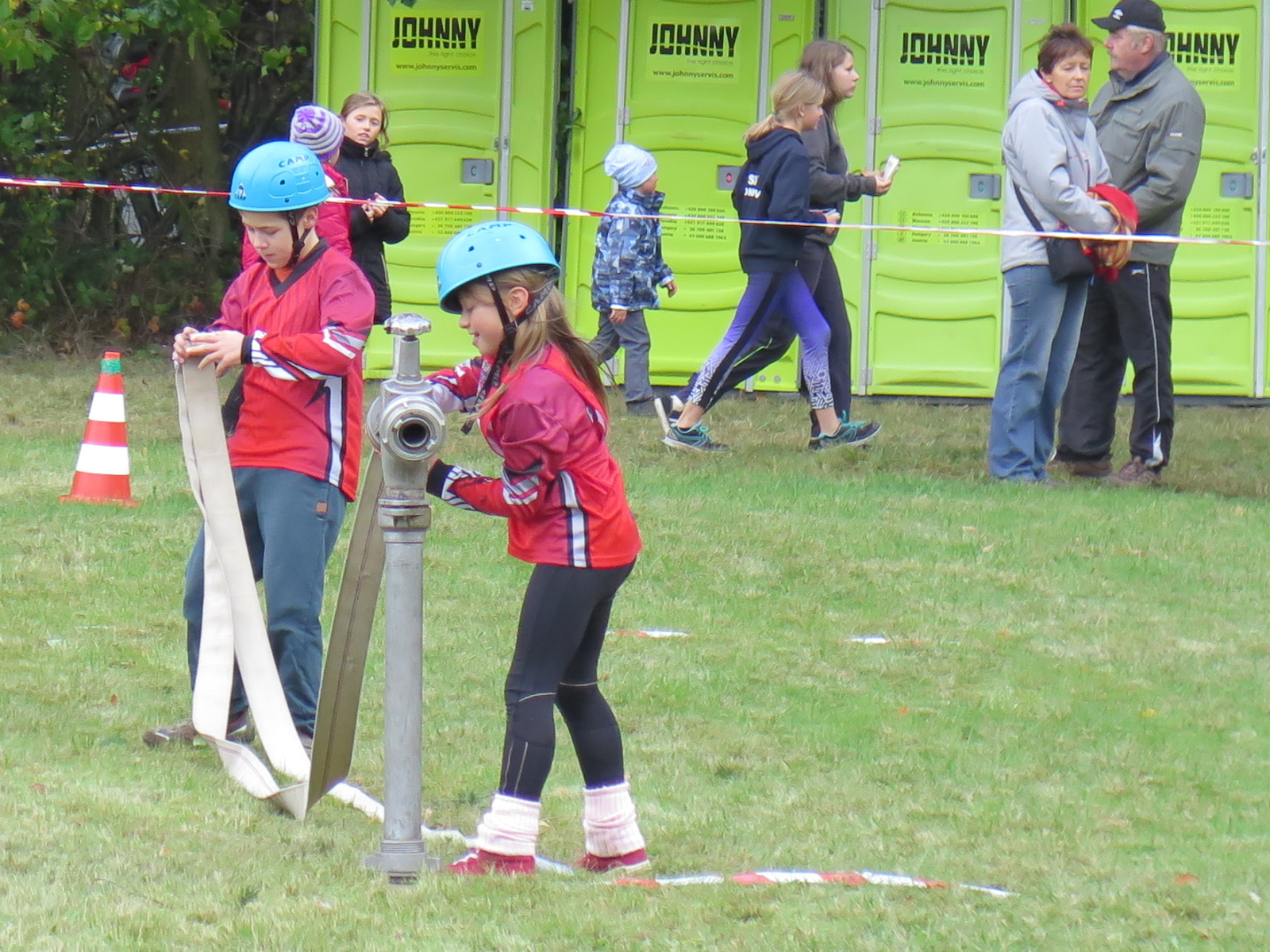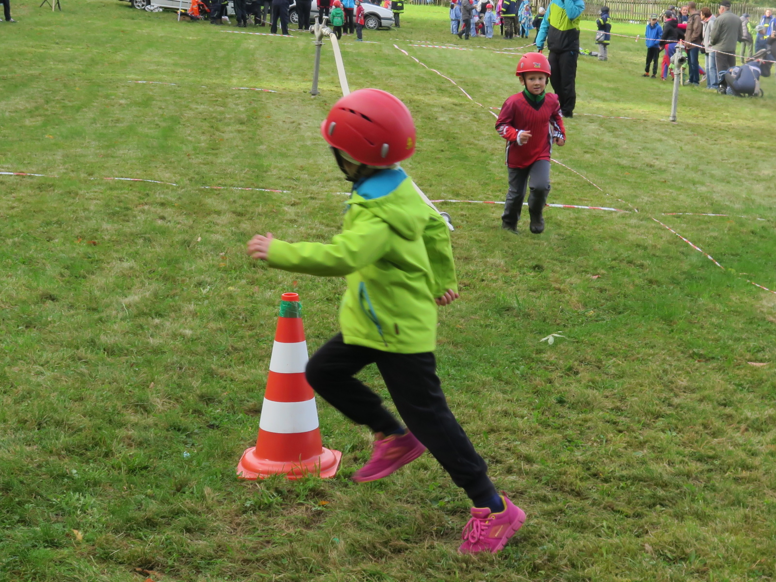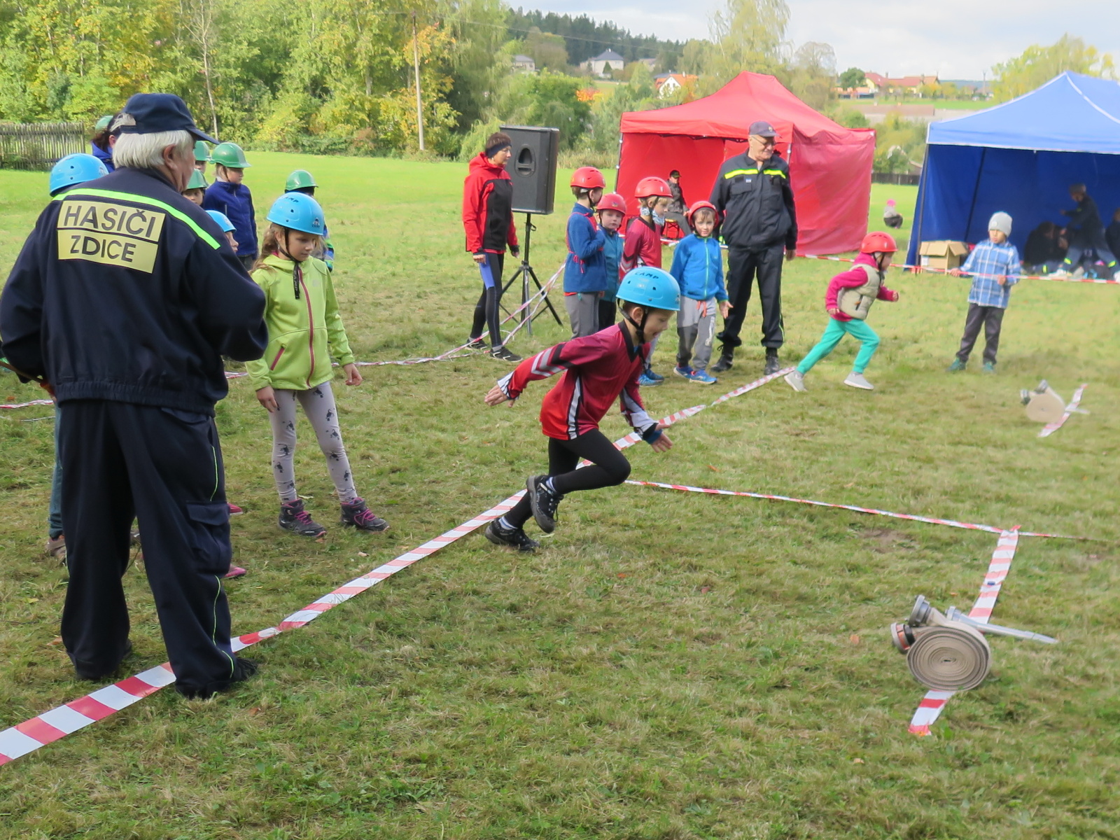 Jeli osobními auty, takže kromě Pepíka a Michala, ještě zajistil dopravu Honza Kuncl s Veronikou Brabcovou a další auto brala Verča Jedličková. Na místě jsme postavili stan, takže jsme mohli být alespoň trochu schování před větrem. Naše přípravka (historicky první účast naší přípravky na soutěži Plamen) měla startovní číslo 1 a tak startovala jako první v sestavě Ondra Bartoš, Jenda Kuncl, Anežka Libusová, Kuba Osvald za doprovodu Veroniky.