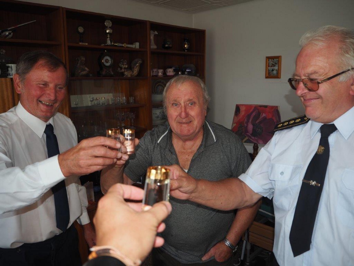 Tradiční a milé povinnosti se za výbor zhostil rovnou starosta Pepík Štětka a velitel Venca Vořech. S dárkovým košem a v uniformách zazvonili u domu pana Veverky za světla. Odcházeli po setmění, po pohoštění a s voláním - vše nejlepší Stando a hodně zdraví! A na viděnou na dalších hasičských akcích!