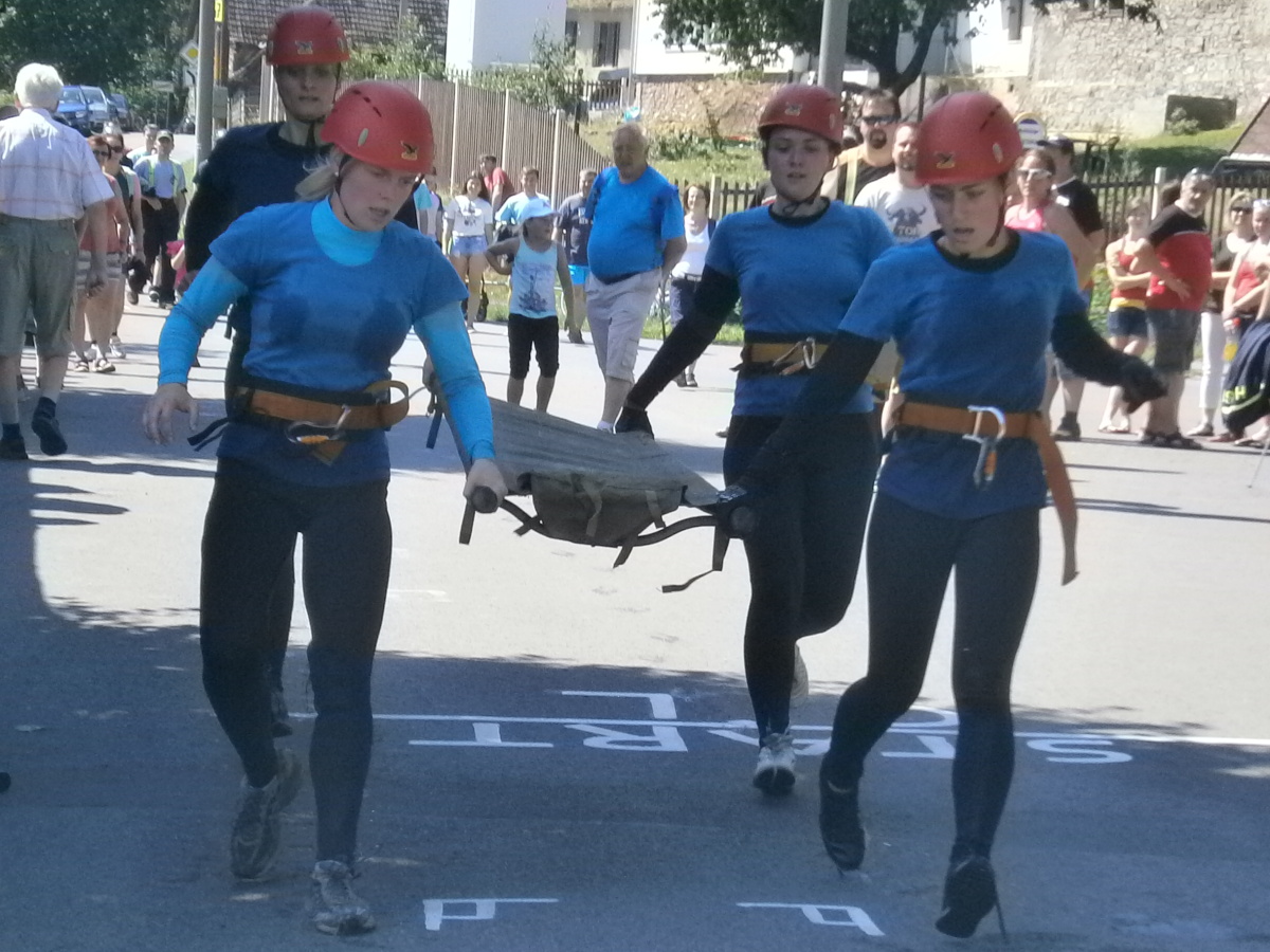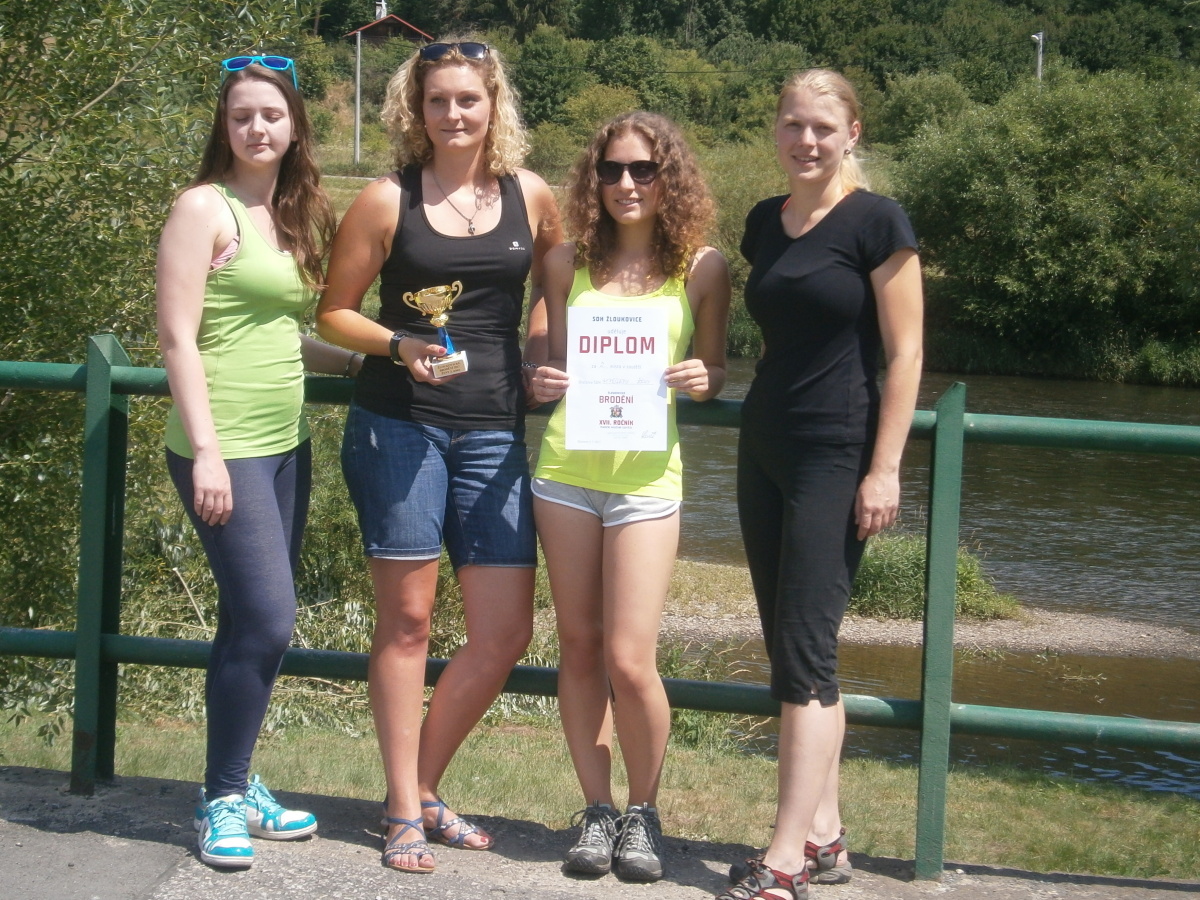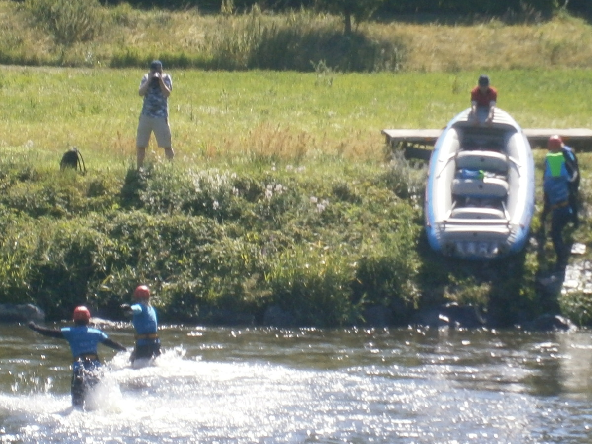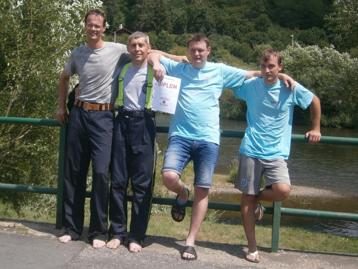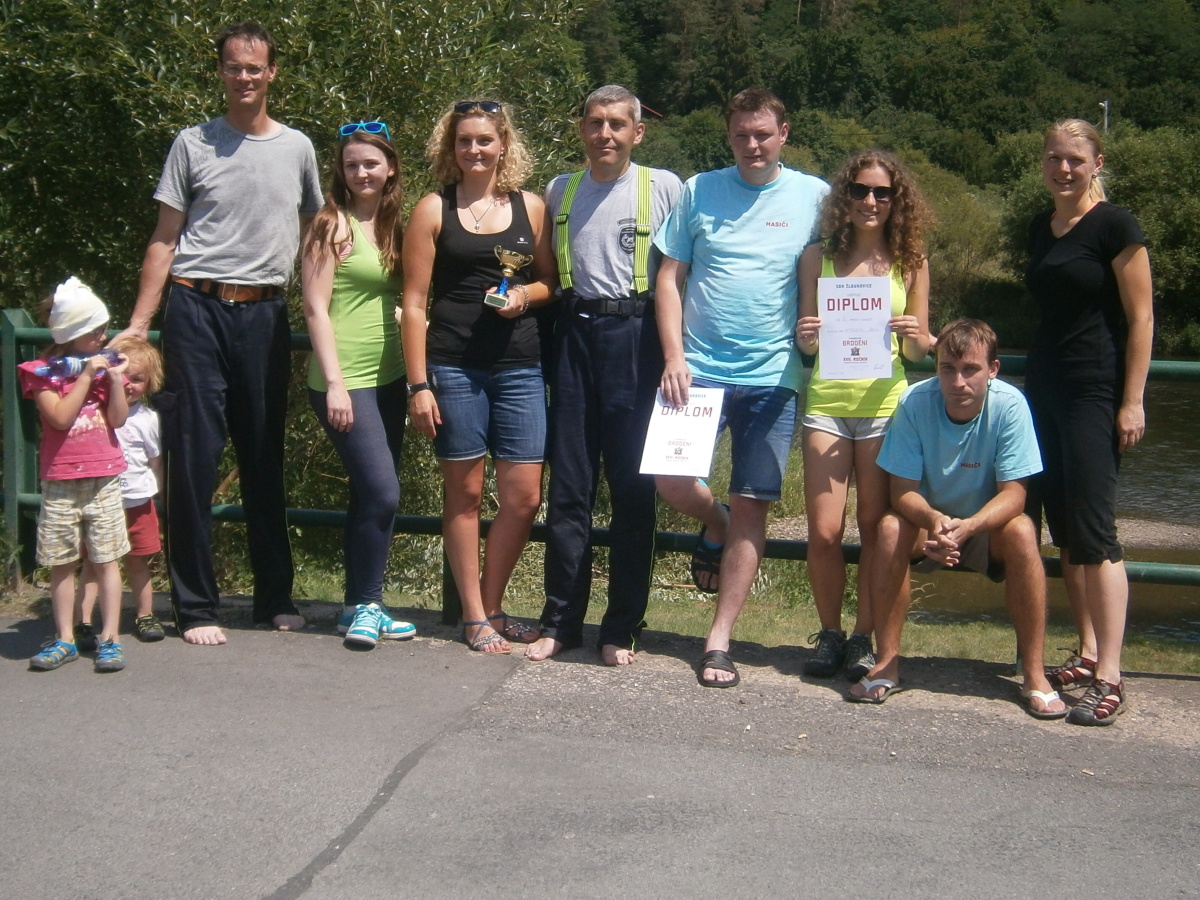 První z našeho sboru nastoupily na start ženy. Slanění z mostu proběhlo dobře, avšak s menším zdržením u Kátina uzlu. Při naloďování do raftu Míša uklouzla a sjela přímo pod něj do vody, koukala jí jen helma. Potloukla se o kameny, ale závod zkušeně dokončila. Jízda na raftu se celkem podařila. Samozřejmě nebyla podle původních představ a domluv, ale nevadí, hlavně, že byl naložen barel. U zdravovědy nebylo co vytknout. Kýble už byly opravdu dno sil, přesto je holky zvládly a za obrovské podpory fanoušků doběhly do cíle. Výsledkem bylo 2. místo za vítězkami z Broum. Kluci nastupovali na start jako poslední družstvo. Vteřiny, které ztratili při slaňování, dokázali nahnat rychlou jízdou na raftu a s přehledem naložili barel. A pak, někde mezi broděním a nošením kýblů, ztratili hodně času. Neudělali nic špatně, přesto nebyli z nejrychlejších. Možná zpomalili, možná docházeli poslední síly… Z pohledu diváka ze břehu se to radí. Jen ten, kdo tuto soutěž sám běžel, tak ví…