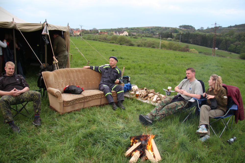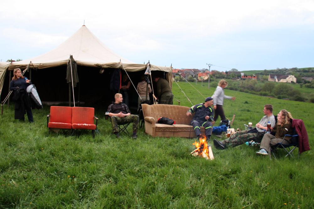 Kluci připravili nejen hezkou hranici ale i příjemné zázemí připomínající pohodlí obývacího pokoje včetně točeného piva a velkého stanu pro případ deště.