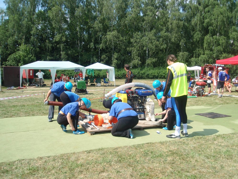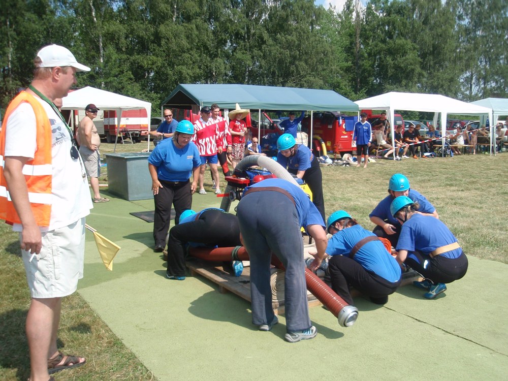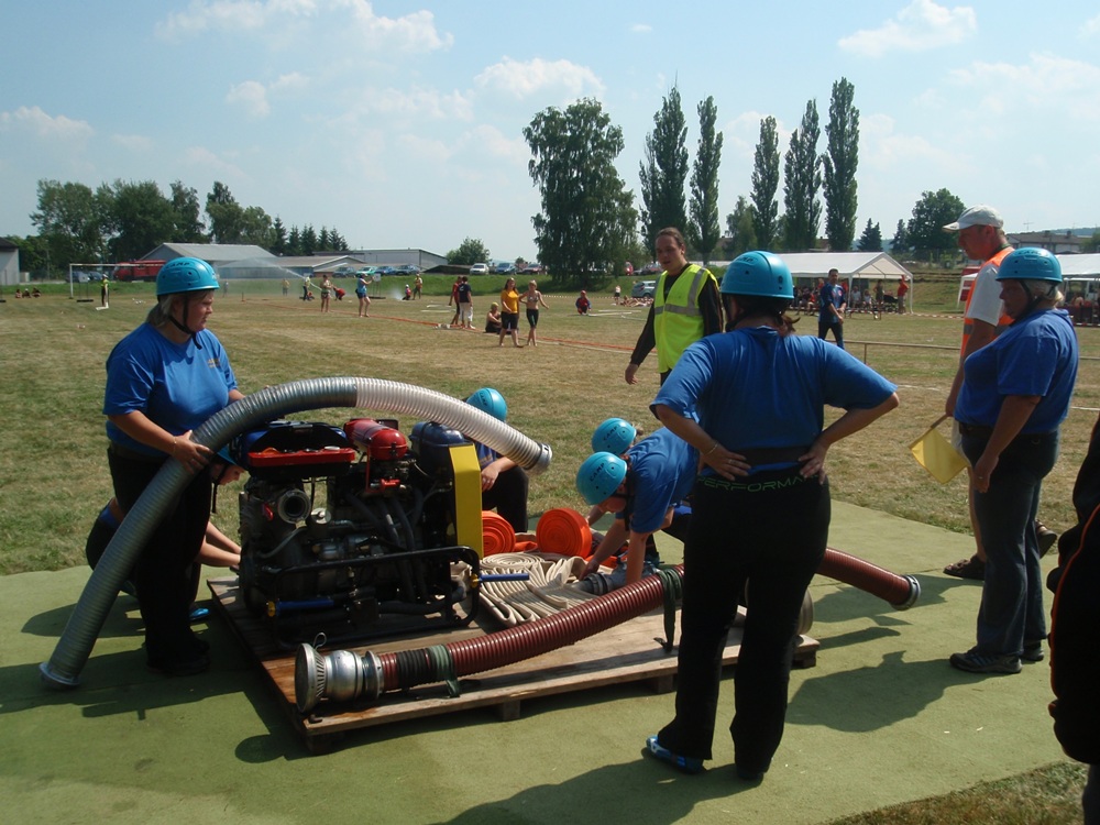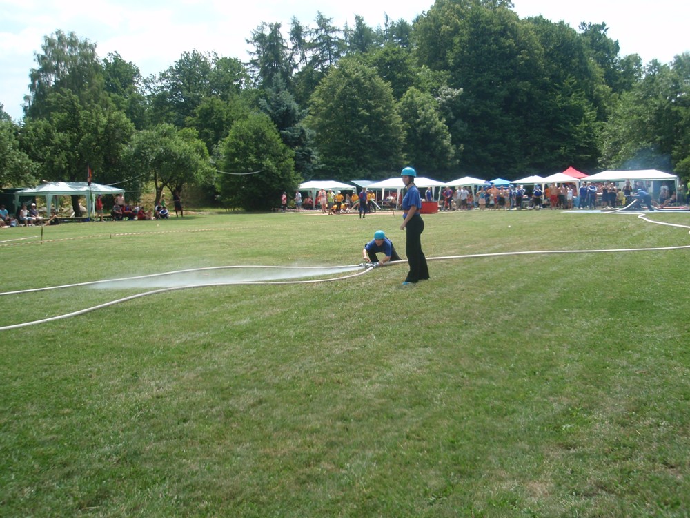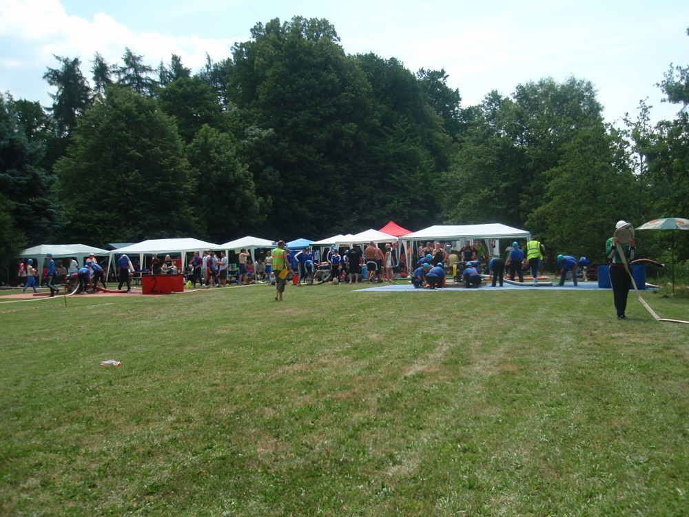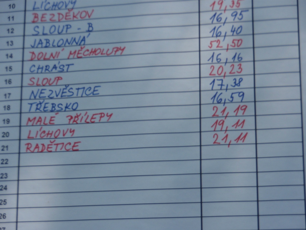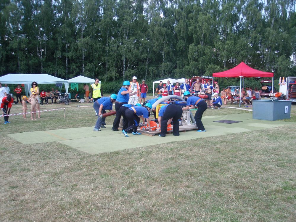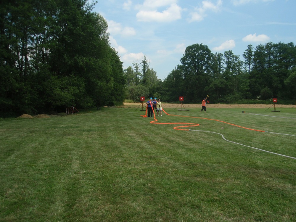 Po česnečce od pana domácího jsme se vydali ve stejném složení Na Valchu. Stejně jako předchozí den jsme nejdřív postavili stany, vyložili nádobíčko, nafoukly dětem bazének a ochotní kluci nanosili vodu. Někteří se museli nejprve zchladit a protože se do bazénku vešlo více lidí najednou, tak toho náležitě využili. Ti, na které se nedostalo, skončili v jedné ze dvou kádí. Devatenácté místo nám připadlo při losování. Nádherný čas 21,19s nám zaručoval postup do play off, dokud nenastoupila děvčeta z Radětic a na světelné tabuli se po sestřelení terčů neobjevil čas o 8 setin lepší, tedy 21, 11s. Tímto časem nás radětické odsunuly na konečné 5. místo.