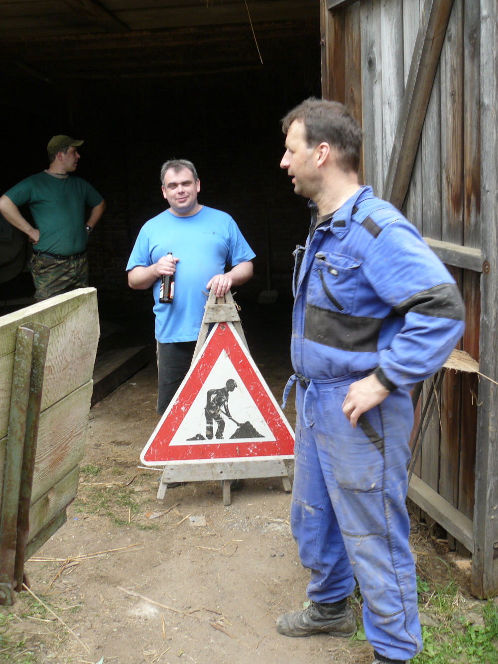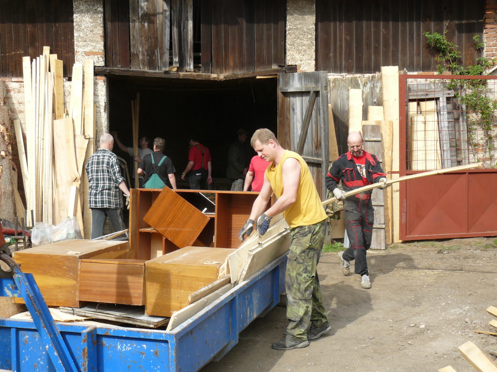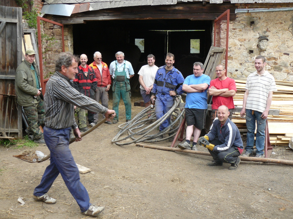 Sešlo se nás nebývale hodně, včetně Jaroslavů, takže jejich svátek byl oslaven i prací. V sobotu (27.4.) jsme naložili několik valníků vysloužilého nábytku a dalšího dřeva - vatra o čarodějnicích pomohla s úklidem. Ten se povedl ve stodole natolik, že se ke slovu dostala také košťata a prokoukla i podlaha. Hasičská technika byla doslova oprášena a vyklizený prostor vypadal hned větší. Jak dlouho? I když sil ubývalo, práce šla většině zúčastněných od ruky natolik, že v závěru zbyl čas i na instruktáž, jak nosit materiál na lopatě. Teoretické přednášky se ujal sám starosta a praktickou ukázku předvedl udivenému družstvu velitel - viz. foto.