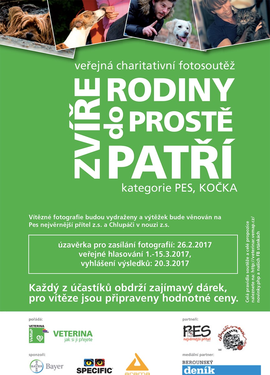Zřízení nové veterinární ordinace v Malých Přílepech v budově bývalého výboru si asi nešlo nevšimnout. Budova doznala změn nejen zvenku, ale zejména uvnitř. Jak jsem zjistil, tak se tam neomezují jen na péči o zvířátka a někdy i o jejich majitele, ale též se snaží podporovat charitativní projekty. A jeden takový teď právě probíhá. Kdo by se tedy chtěl účastnit soutěže a má v rodině nějakého kočičího nebo psího mazlíčka a je ochoten vytvořit a poslat nějakou fotku do soutěže, může tak učinit do 26. února 2017 na email kontakt@vemap.cz (při větším počtu fotek max. 5 případně využít služeb např. úschovny).