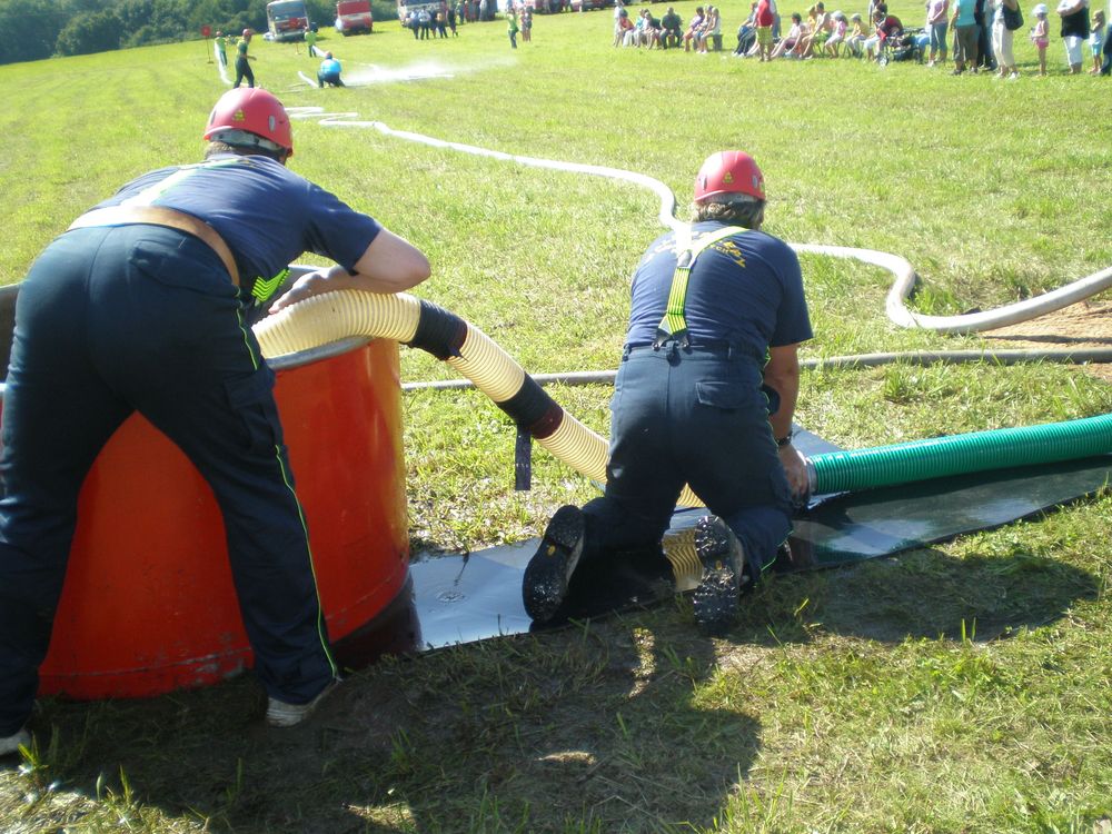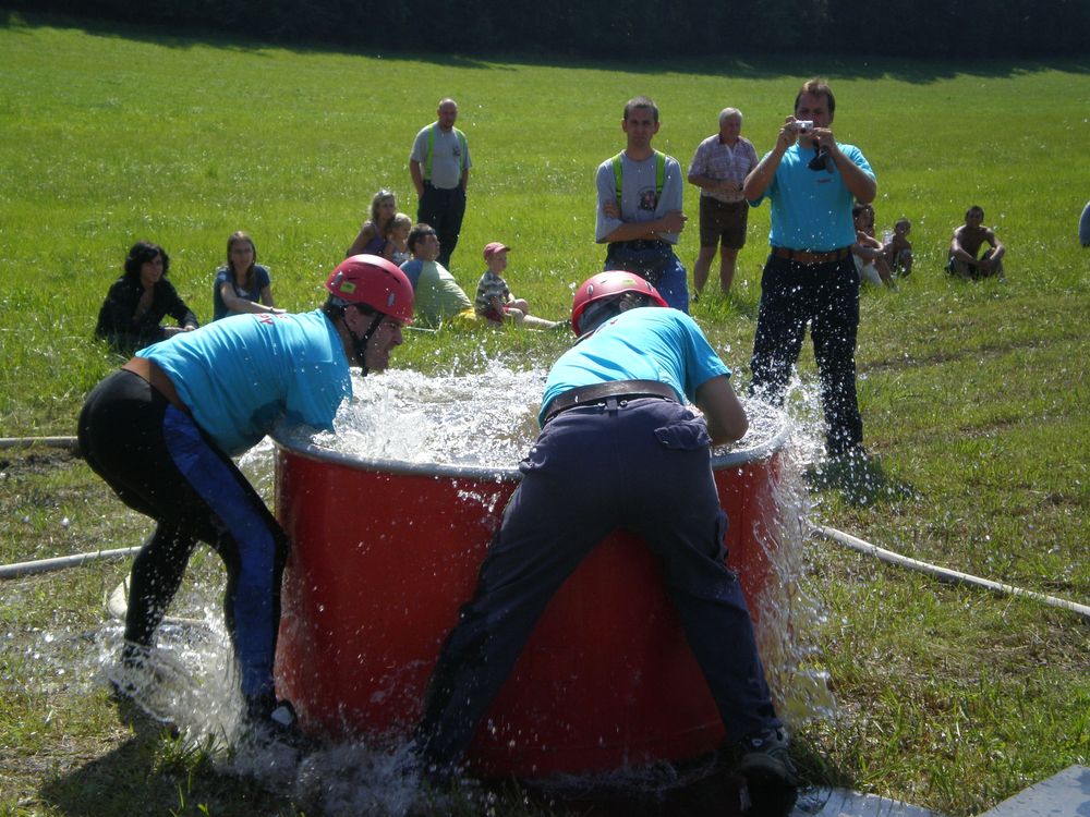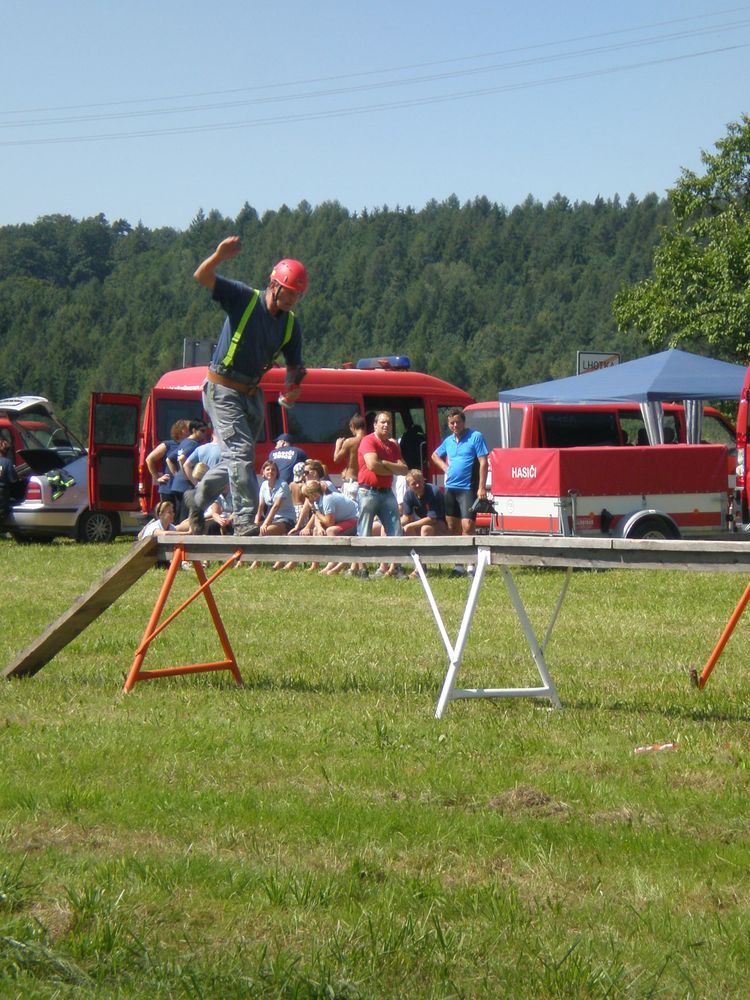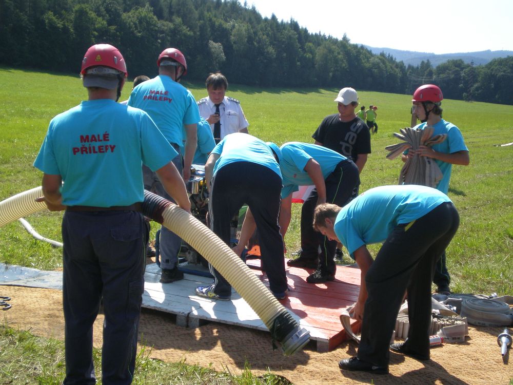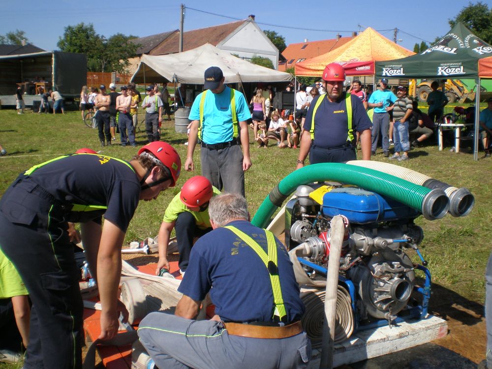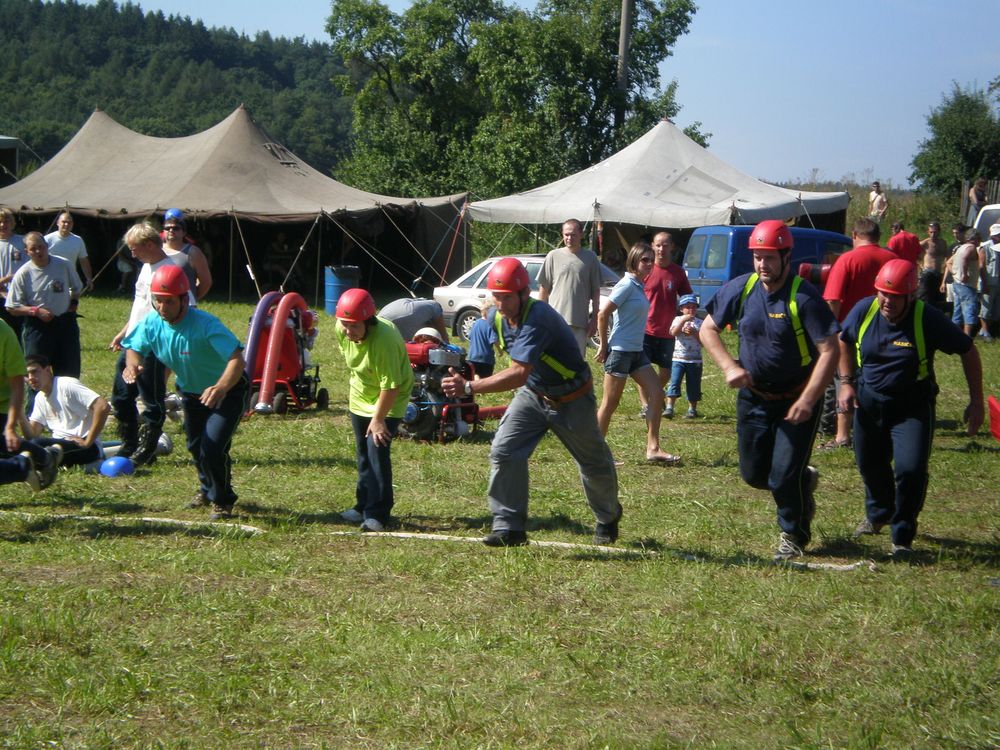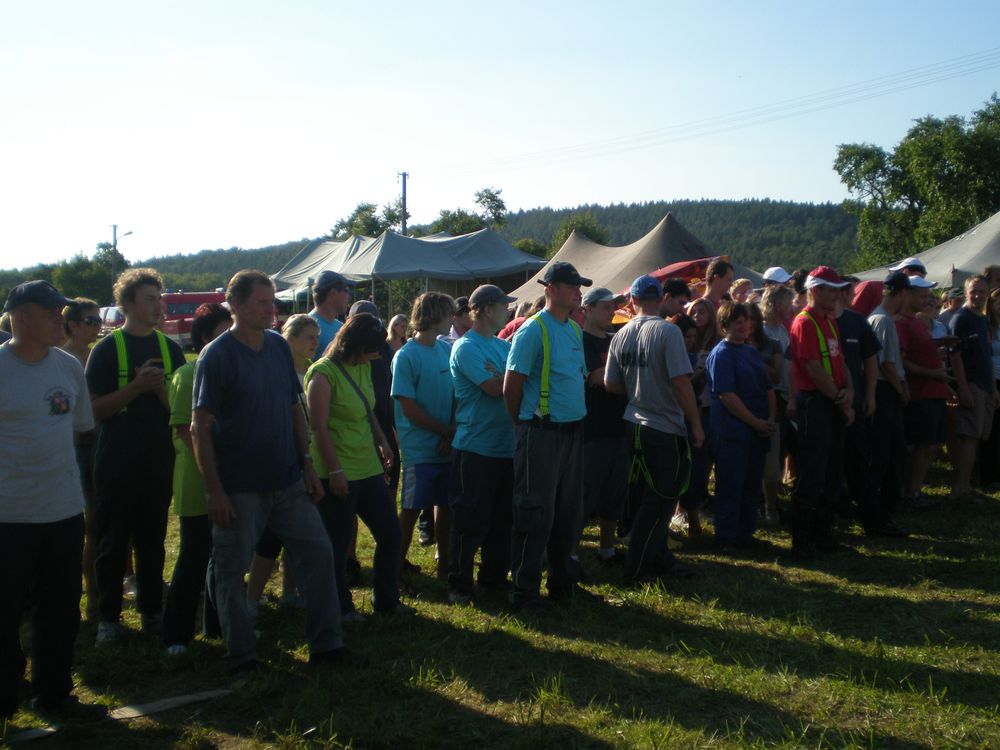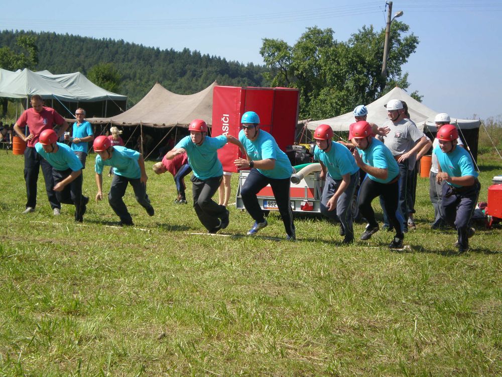 Po delší době se nám na soutěž v rámci našeho okrsku podařilo postavit dvě mužská družstva. I když v případě družstva "B" to tak zcela neplatí, protože na postu proudařek se představily Věra se Zdeňkou a nutno dodat, že si nevedly vůbec špatně. A tak jsme na Lhotku odjížděli plni očekávání. Letošní ročník začal poněkud netradičně. Po nástupu soutěžních družstev, na louce pod vesnicí, po kterém proběhlo přivítání od místních hasičů, se všichni odebrali ke lhotecké kapličce, kde byl opět proveden nástup.