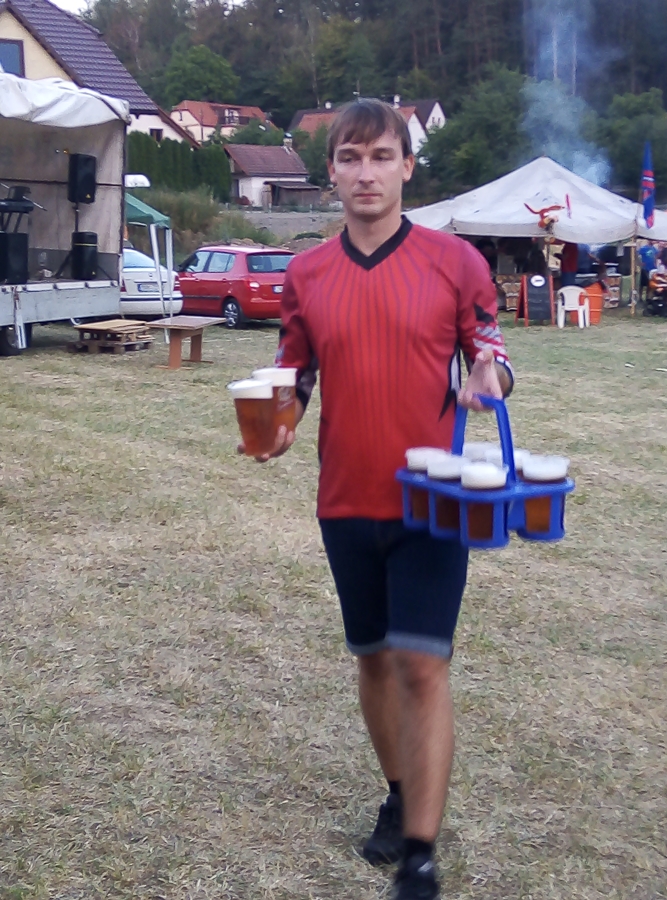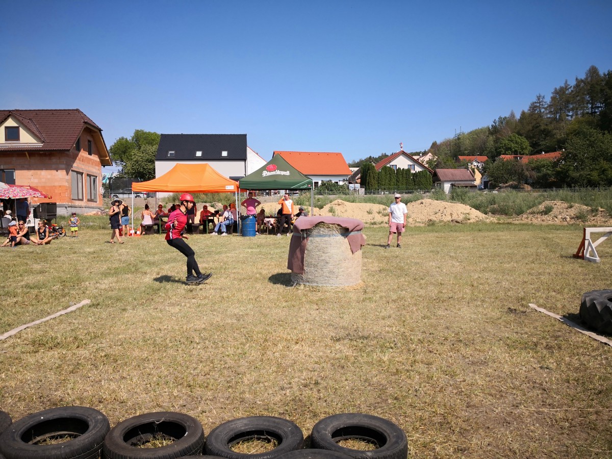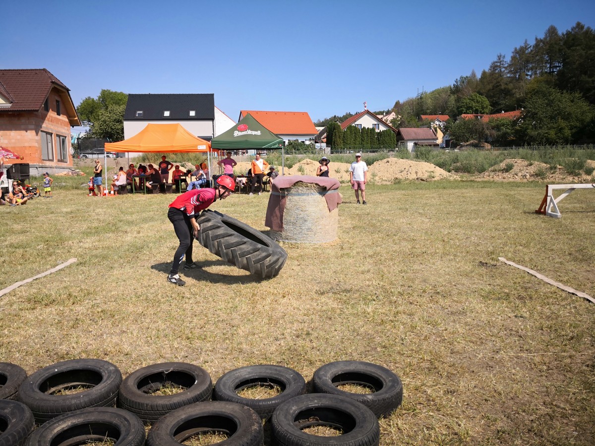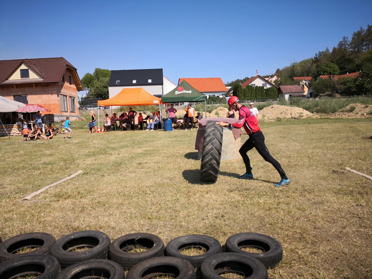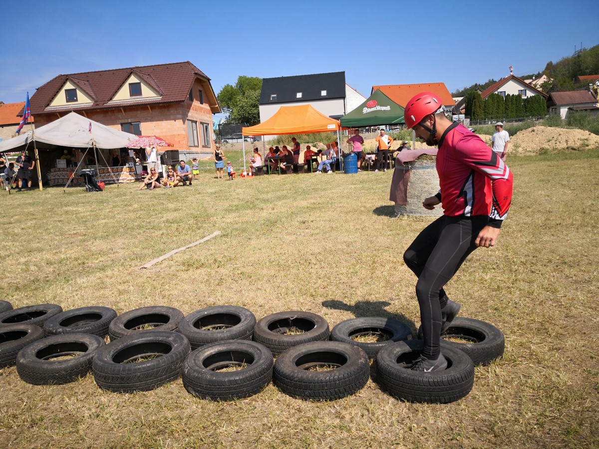 Za muže jako první z našeho družstva vyběhl Matěj. Překážku v podobě balíku sena spíš přeletěl, než přeskočil, a vypadal na to, že by si klidně odběhl zbytek sám. Což bohužel možné nebylo, takže se na další úseky vypravili Honza a Martin. I když nepatří zrovna mezi místní „kulturisty“, musíme uznat, že se s minimálně dvakrát širší pneumatikou porvali dosti zdařile. Na poslední úsek se vydal Jirka, který proběhl pneumatikami tak rychle, že by jeden řekl, že to doma trénuje i ve spaní. Naprosto vydařené úseky klukům ve štafetě vynesly prozatímní 1. místo.