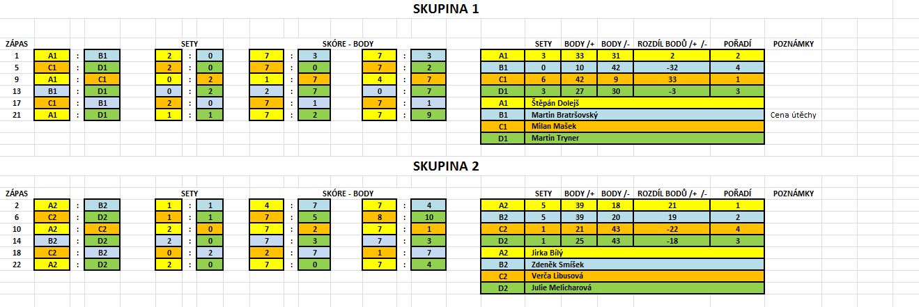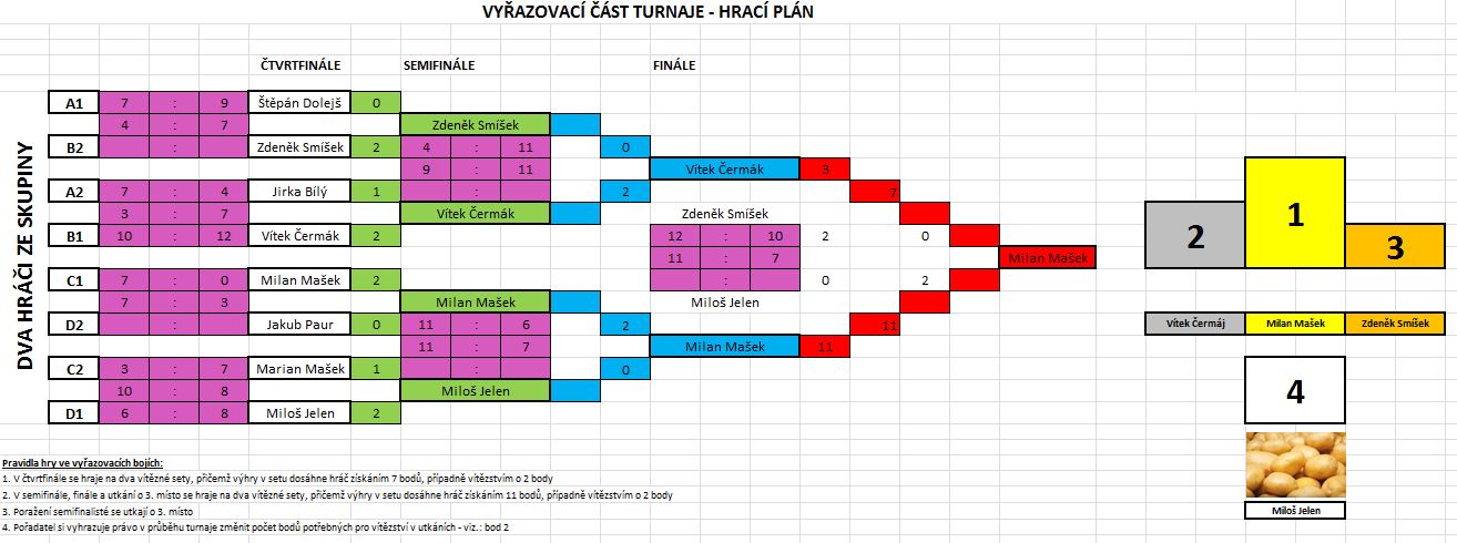 Své síly přišlo poměřit celkem 16 hráčů všech věkových kategorií. A že se bylo na co dívat! O napínavé souboje nebyla nouze a celý turnaj plynul bez zádrhelů. Celkovým vítězem turnaje se stal Milan Mašek, který prošel turnajem bez zaváhání a na své cestě za vítězstvím porazil i zkušené a ostřílené matadory, kterým forma uvadala úměrně k času, stráveném v občerstvovací zóně. J Tímto děkujeme obsluze kiosku za skvělý výkon a těšíme se na další pinkání.