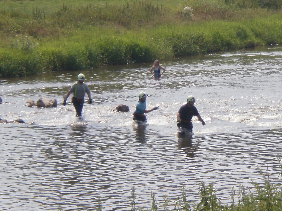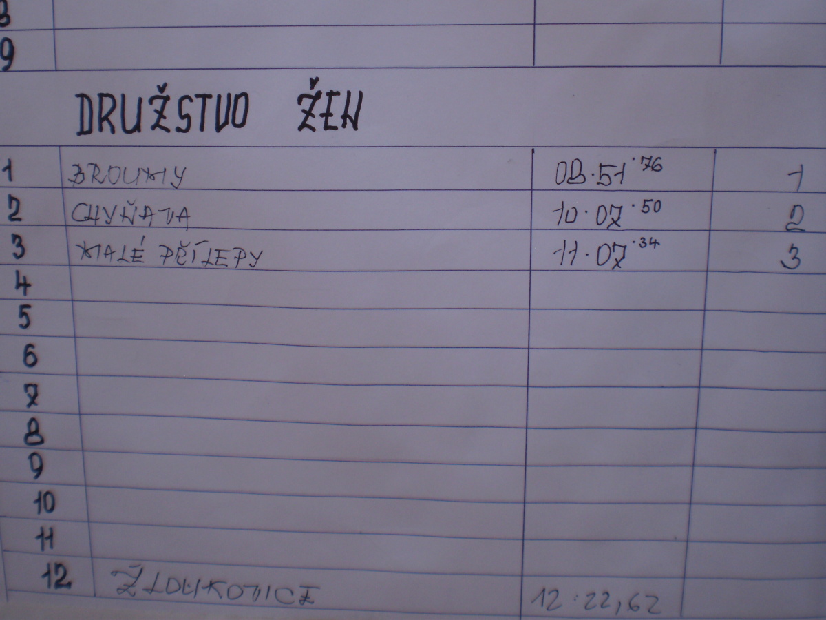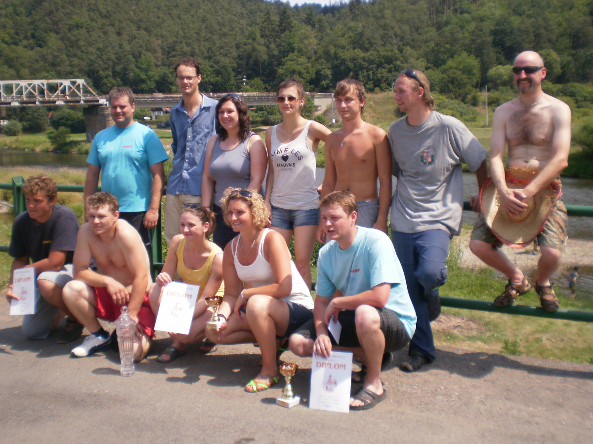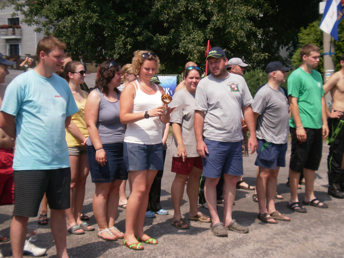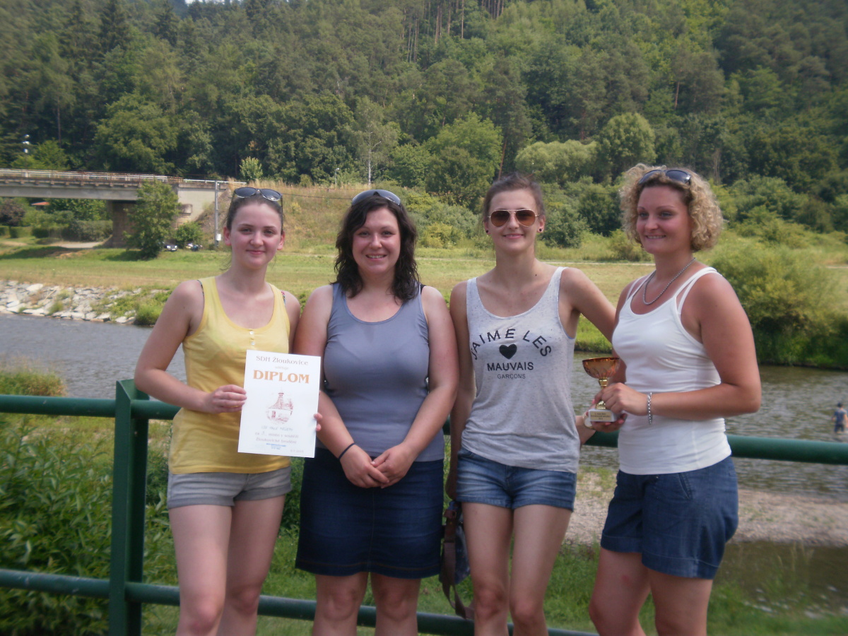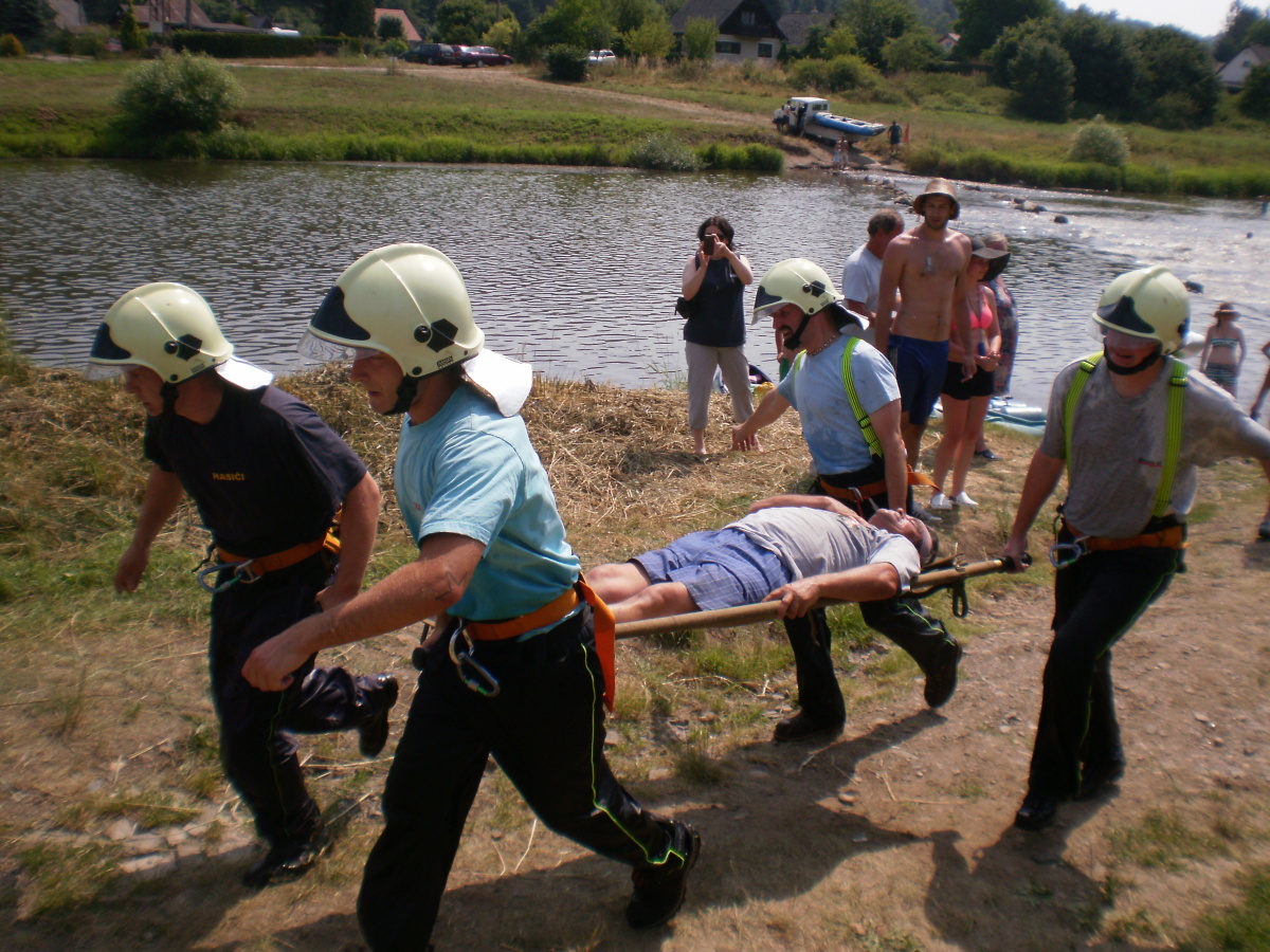 První z našeho sboru tedy nastoupily na start ženy. Slanění z mostu proběhlo velmi dobře a rychle, po přebrodění řeky na druhý břeh však došlo k menšímu zádrhelu. Do ruky se mi dostala nejmenší vesta, kterou jsem přes hrudník prostě nemohla zapnout, což při nalodění do člunu je povinnost. Míša proto musela svléknout svou vestu, abychom je mohly vyměnit. Díky této neplánované módní přehlídce jsme však ztratili min. drahocennou minutu. Jízda na raftu se nám celkem podařila, barel jsme vyzvedly a v pořádku přistály. Brodění na druhý břeh ale nebylo jednoduché, strhával nás proud, takže jsme několikrát upadly. Míša, která běžela jako úplně poslední, protože ještě vylévala barel, také spadla a vůbec se jí nedařilo zvednout. Štěstí, že se zachytla kamene, ze všech sil zabojovala a zvedla se, jinak by ji proud unášel až do Hýskova. Chvíli jsme se zdržely ještě u masáže srdce, kde Štěpka musela více zaklonit hlavu figuríny a opakovat dýchání. Doběh s nosítky do cíle už byl bez problémů. Výsledkem bylo 3. místo s časem 11:07:34 min.
