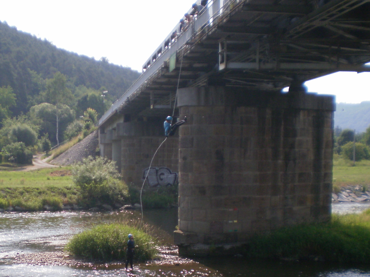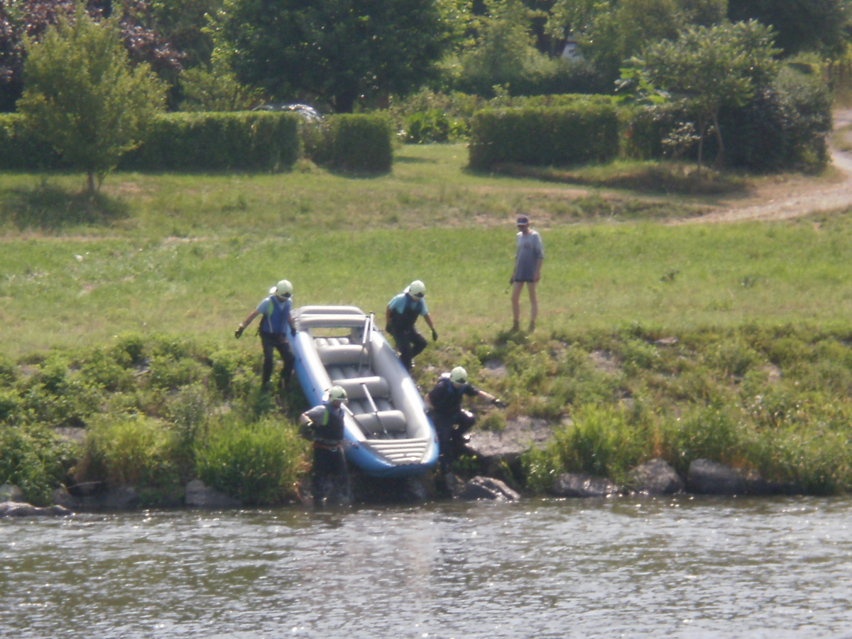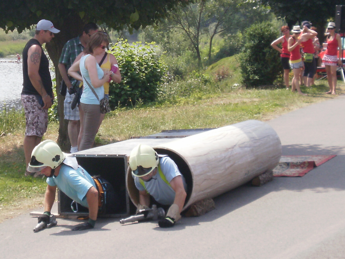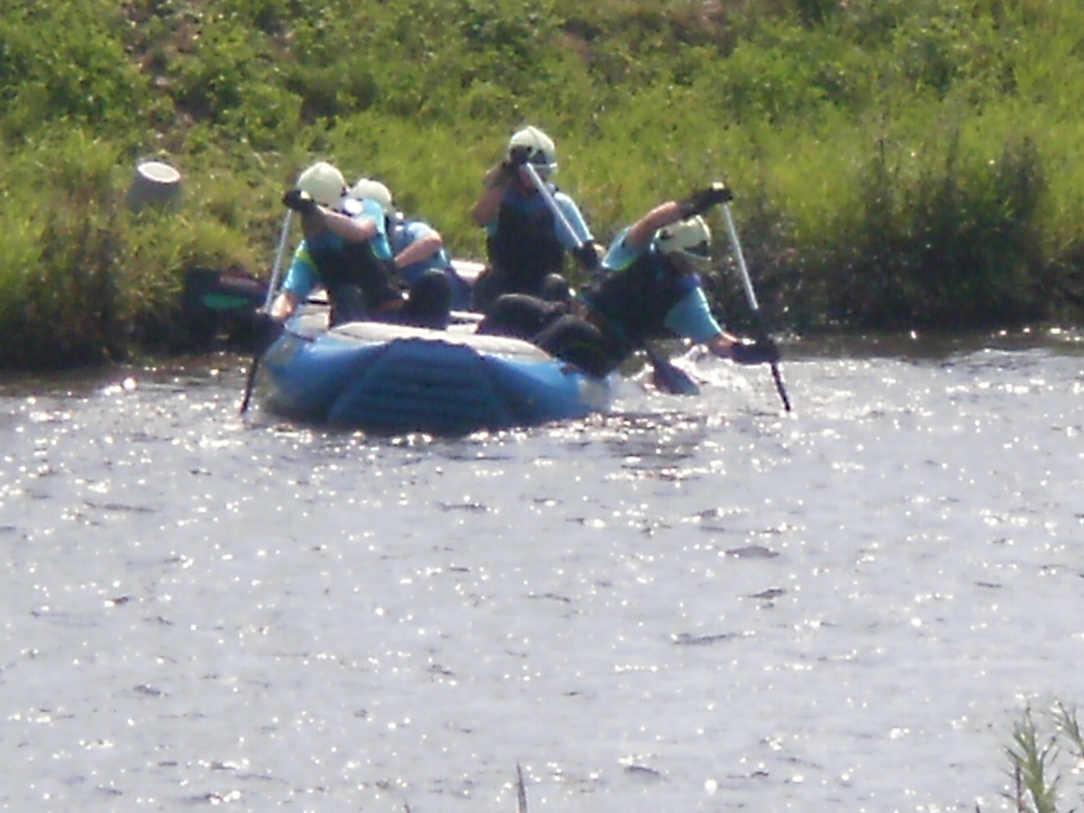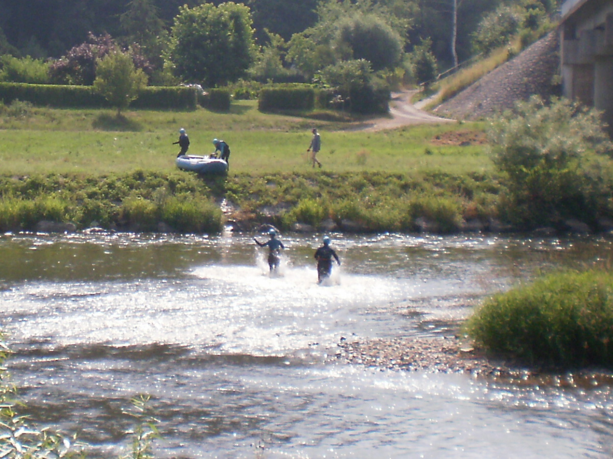První z našeho sboru tedy nastoupily na start ženy. Slanění z mostu proběhlo velmi dobře a rychle, po přebrodění řeky na druhý břeh však došlo k menšímu zádrhelu. Do ruky se mi dostala nejmenší vesta, kterou jsem přes hrudník prostě nemohla zapnout, což při nalodění do člunu je povinnost. Míša proto musela svléknout svou vestu, abychom je mohly vyměnit. Díky této neplánované módní přehlídce jsme však ztratili min. drahocennou minutu. Jízda na raftu se nám celkem podařila, barel jsme vyzvedly a v pořádku přistály. Brodění na druhý břeh ale nebylo jednoduché, strhával nás proud, takže jsme několikrát upadly. Míša, která běžela jako úplně poslední, protože ještě vylévala barel, také spadla a vůbec se jí nedařilo zvednout. Štěstí, že se zachytla kamene, ze všech sil zabojovala a zvedla se, jinak by ji proud unášel až do Hýskova. Chvíli jsme se zdržely ještě u masáže srdce, kde Štěpka musela více zaklonit hlavu figuríny a opakovat dýchání. Doběh s nosítky do cíle už byl bez problémů. Výsledkem bylo 3. místo s časem 11:07:34 min.