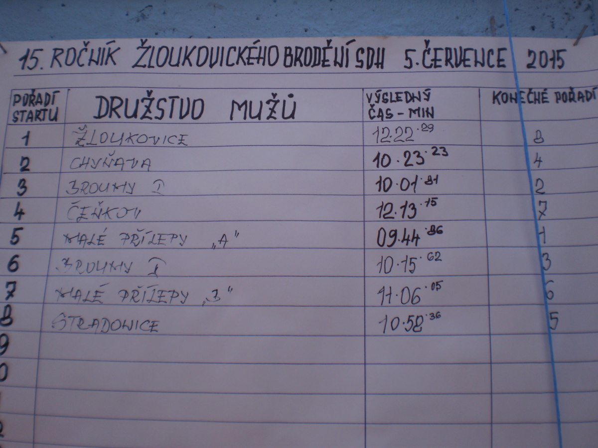 Žloukovické brodění se stalo velmi oblíbenou soutěží i přesto, že se jedná o soutěž hodně fyzicky náročnou. Letos bylo opravdu velké vedro již od rána a zřejmě vzhledem k tomuto počasí a náročnosti soutěže některé sbory vůbec nepřijely. Sešlo se tedy 8 mužských družstev ( z toho MP 2x a Broumy 2x), 3 družstva žen a 1 smíšené družstvo ze Žloukovic, které startovalo mimo soutěž.