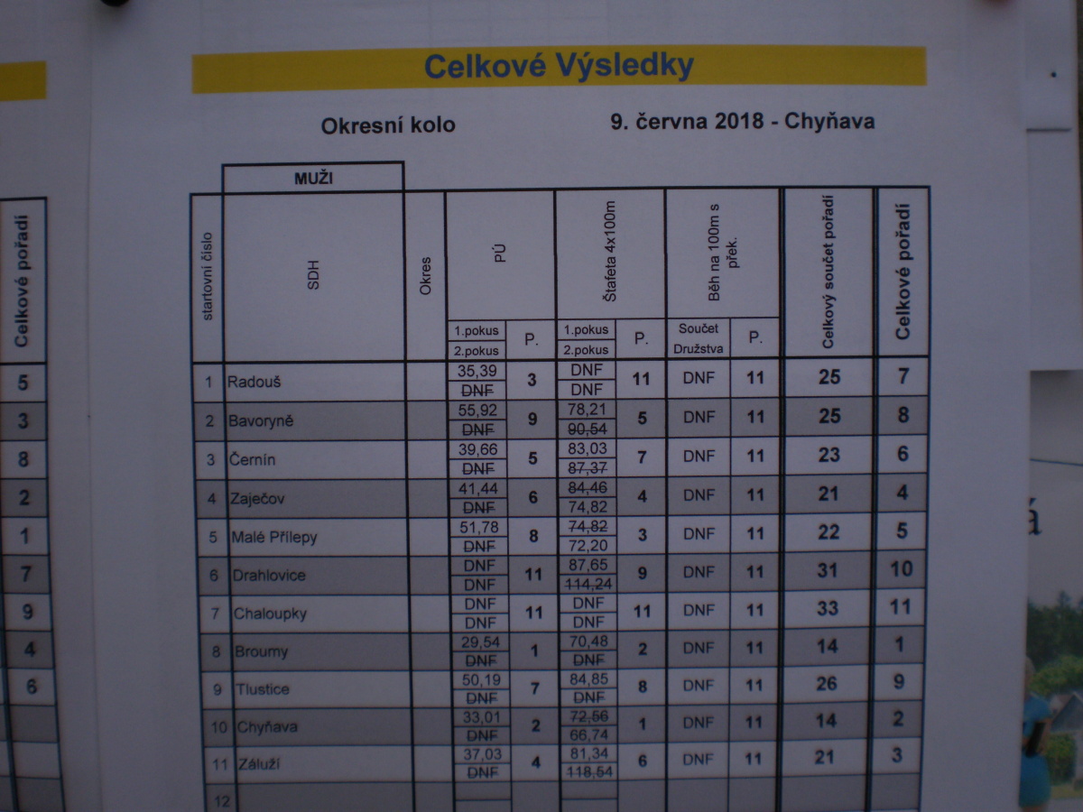 Družstvo mužů rozběhlo útok velmi rychle. Bohužel si na letošní okresní soutěži vybrali pořádný díl smůly, neboť se jim rozpojilo béčko u rozdělovače a připojováním ztratili cenný čas. I přes tento zádrhel však bleskově nastříkali terče. Díky pěknému času II. štafety tak kluci obsadili celkové 5. místo.