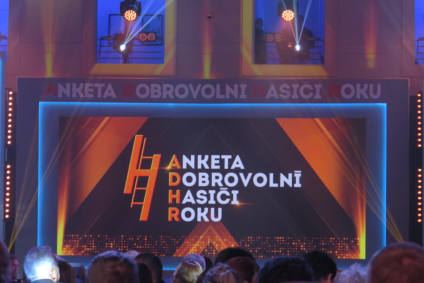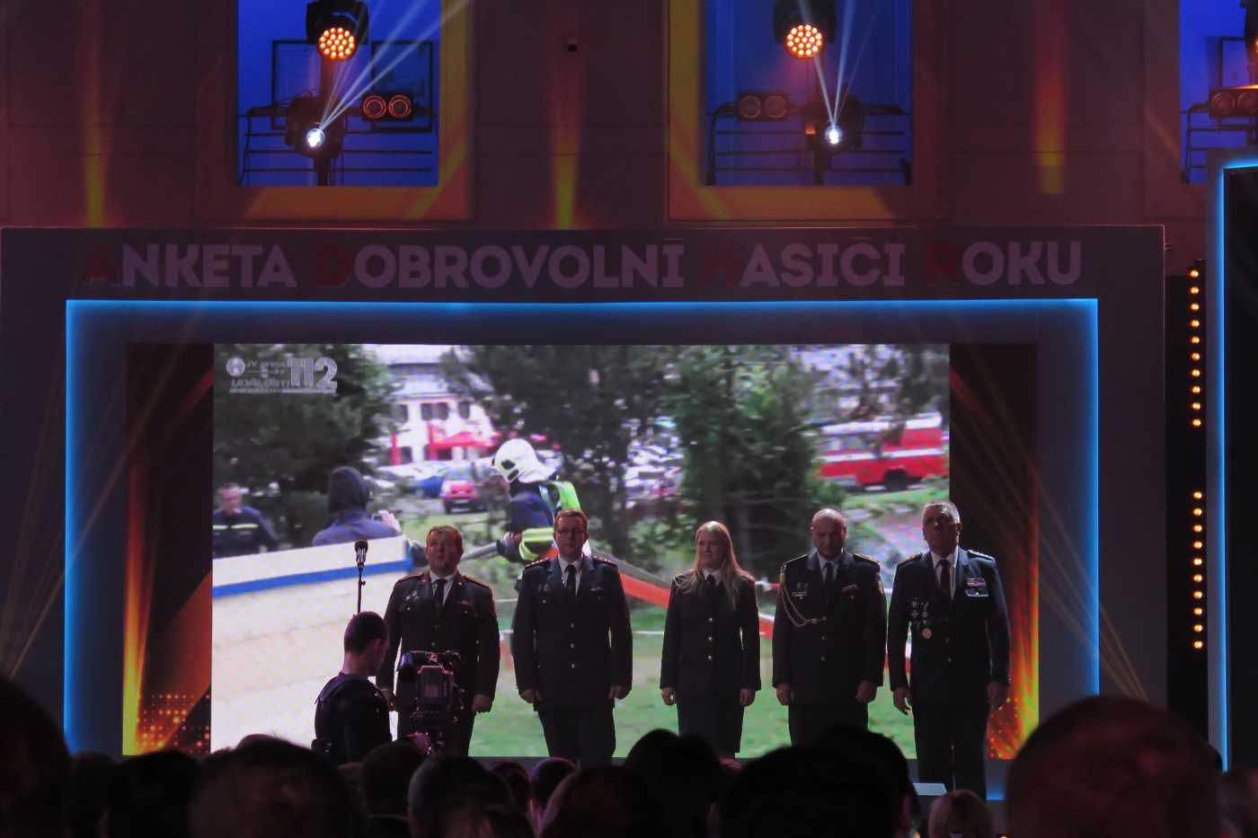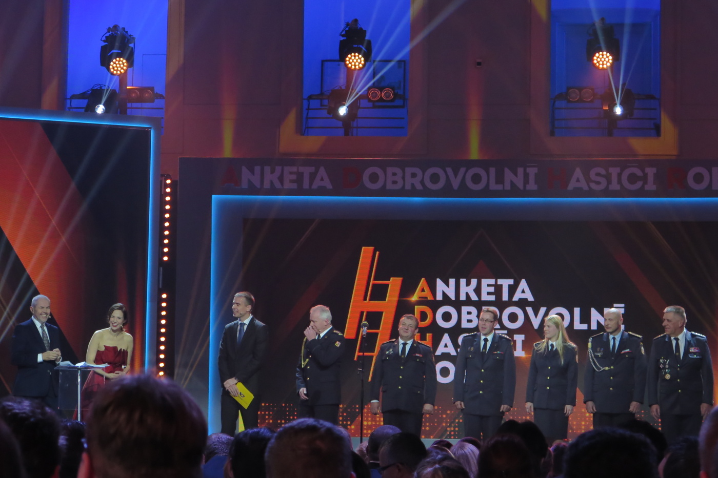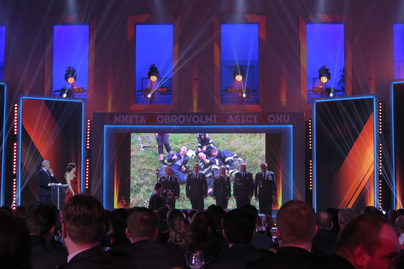 Nechtěli jsme přijet pozdě tak jsme vyrazili se značným předstihem ve 13:30 a měli jsme tak v Brně dostatek času na pozdní oběd v restauraci U Lucerny a nutno přiznat, že jsme si všichni skutečně pochutnali a stihli jsme se včas přesunout do dvorany. Hned nám bylo jasné, proč byla pozvánky pro sbory omezena na 3 zástupce. Letošní anketu moderovala známá a příjemná moderátorská dvojice Marek Eben a Tereza Kostková. Profesionalita této moderátorské dvojice byla v průběhu večera několikrát prověřena při některých neplánovaných situacích a nutno přiznat, že zrovna ty neplánované situace zaznamenaly největší úspěch. Slavnostní večer zahájila patronka akce Ilona Csáková novou písní složenou pro hasiče.