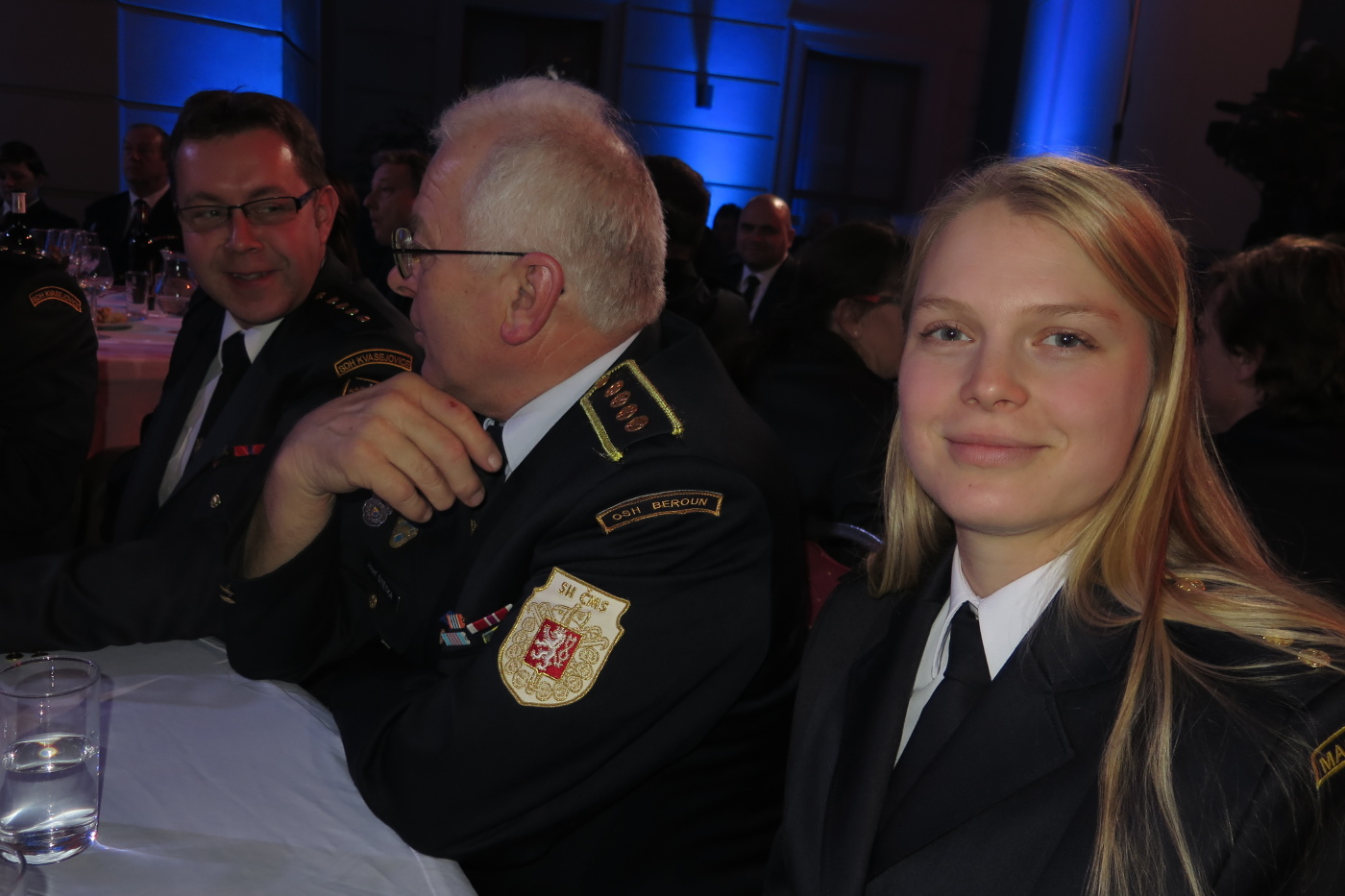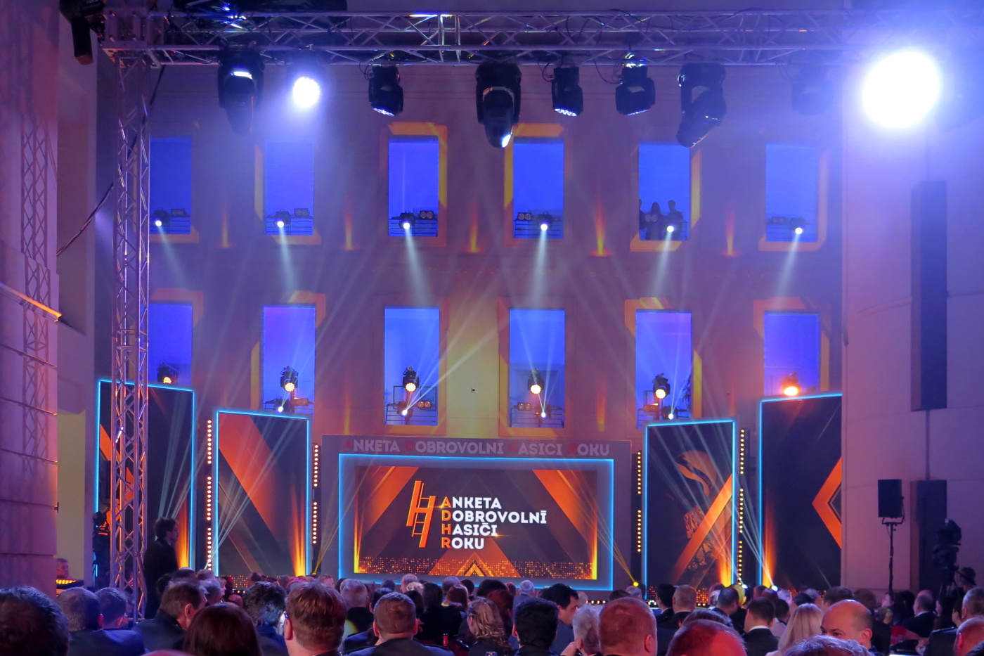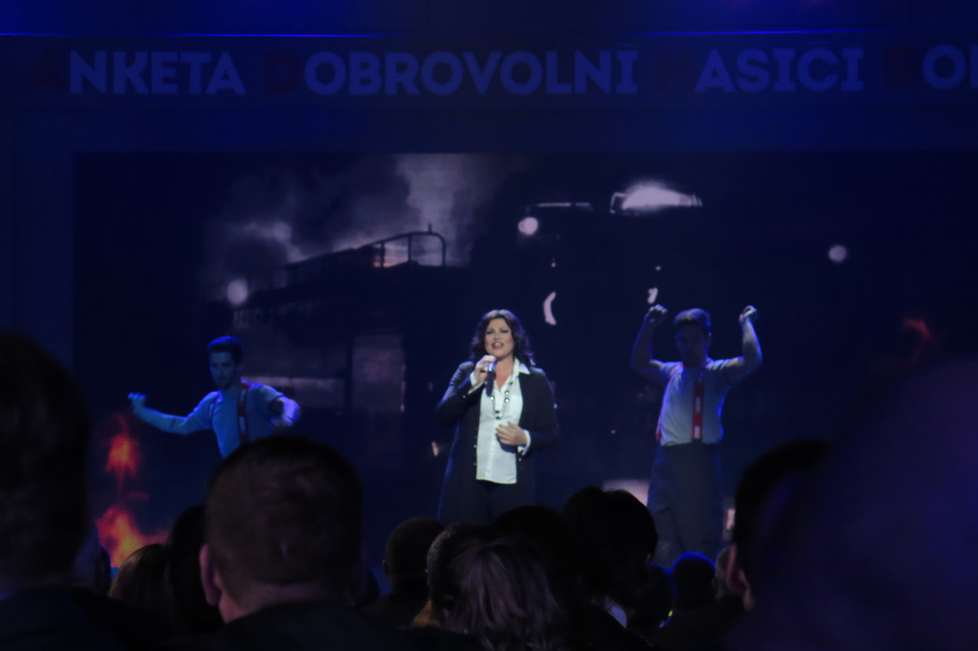 Nechtěli jsme přijet pozdě tak jsme vyrazili se značným předstihem ve 13:30 a měli jsme tak v Brně dostatek času na pozdní oběd v restauraci U Lucerny a nutno přiznat, že jsme si všichni skutečně pochutnali a stihli jsme se včas přesunout do dvorany. Hned nám bylo jasné, proč byla pozvánky pro sbory omezena na 3 zástupce. Letošní anketu moderovala známá a příjemná moderátorská dvojice Marek Eben a Tereza Kostková. Profesionalita této moderátorské dvojice byla v průběhu večera několikrát prověřena při některých neplánovaných situacích a nutno přiznat, že zrovna ty neplánované situace zaznamenaly největší úspěch. Slavnostní večer zahájila patronka akce Ilona Csáková novou písní složenou pro hasiče.