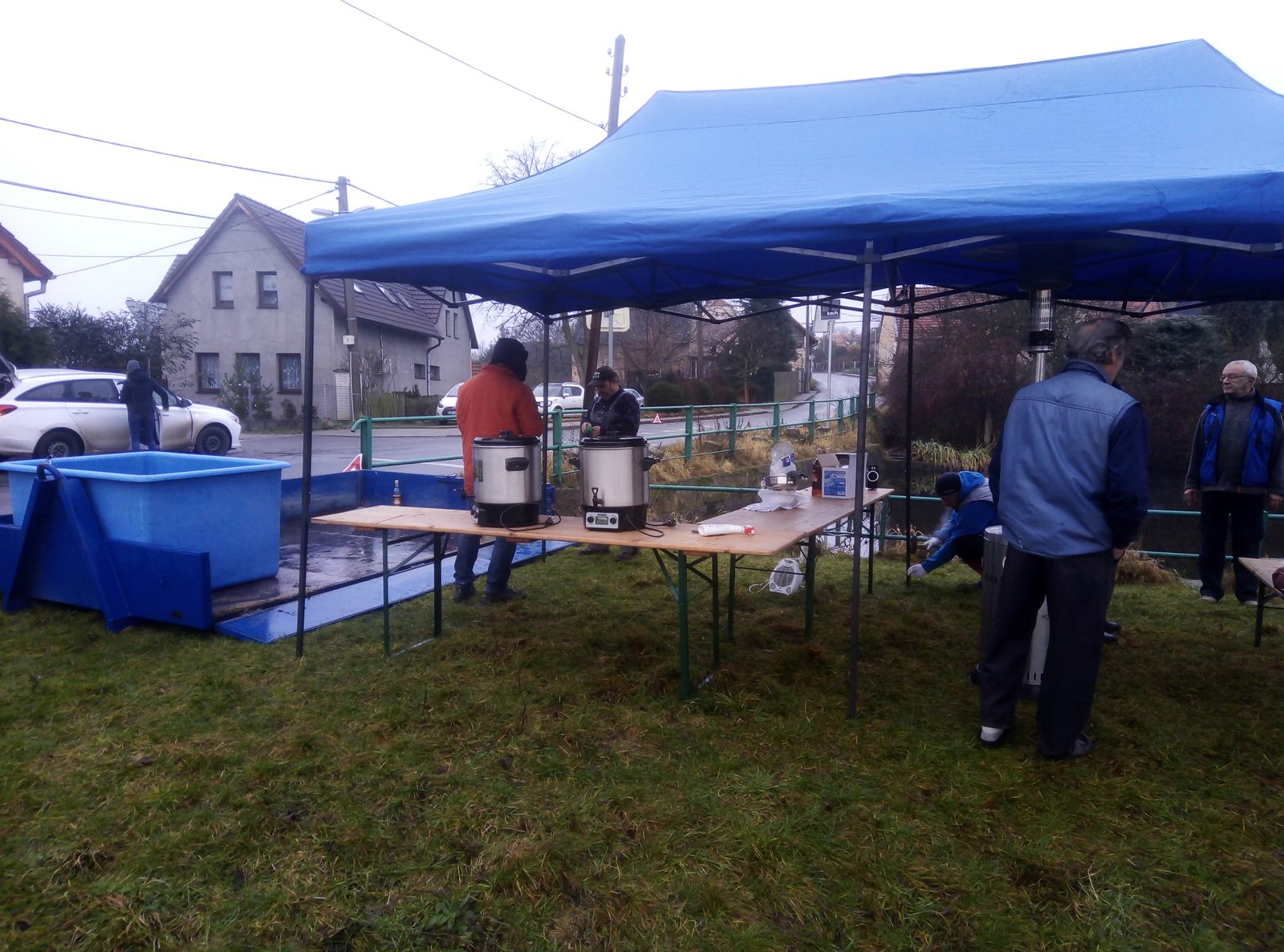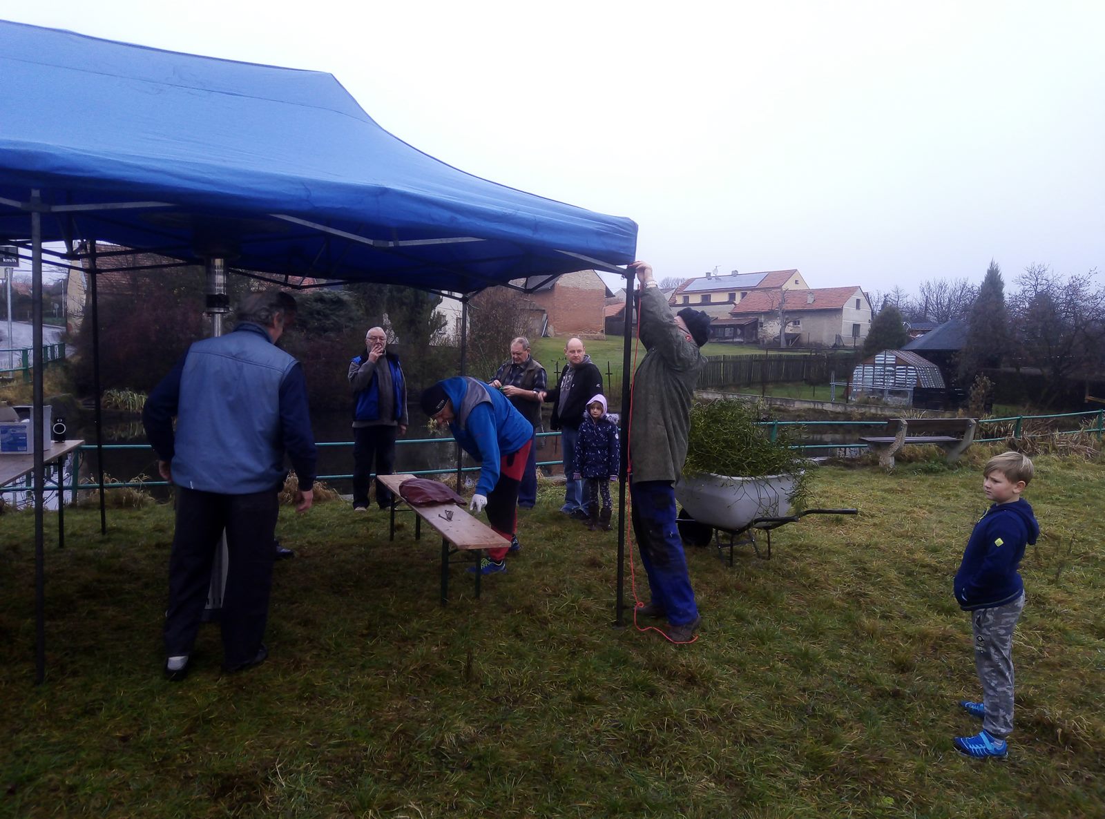 Hlavní organizátor akce, Jirka Hrázný Smíšek jr. svolal na brzké ráno hasičskou brigádu, při které jsme u jezera vybudovali zázemí. První zákazníci na sebe nenechali dlouho čekat, a tak měl mistr řemesla celý den plné ruce práce. Jak při výlovu, tak i při odesílání kapříků na věčnost. Tentokrát bylo kaprů přes 70 ks! Celá akce se nadmíru vydařila a určitě na ni budou vzpomínat nejen přeživší kapříci, ale i přeživší návštěvníci, které neporazili ani plné várnice s grogem a svařeným vínem. :-)
