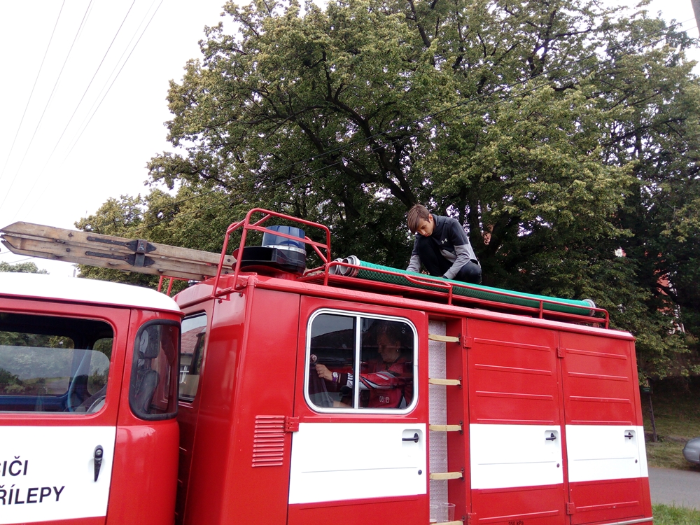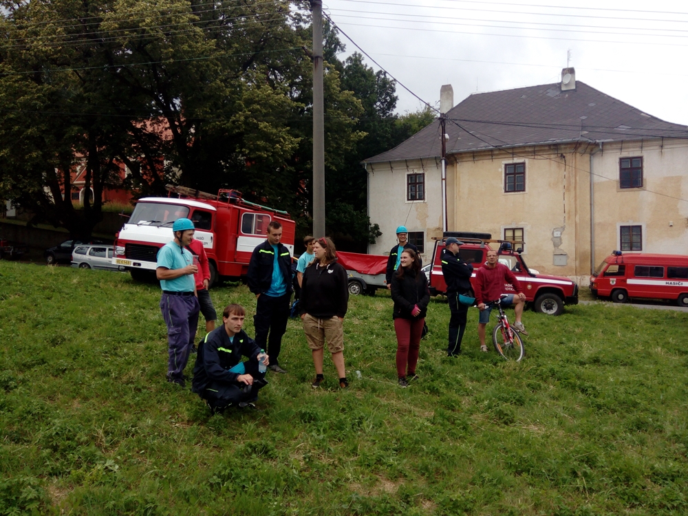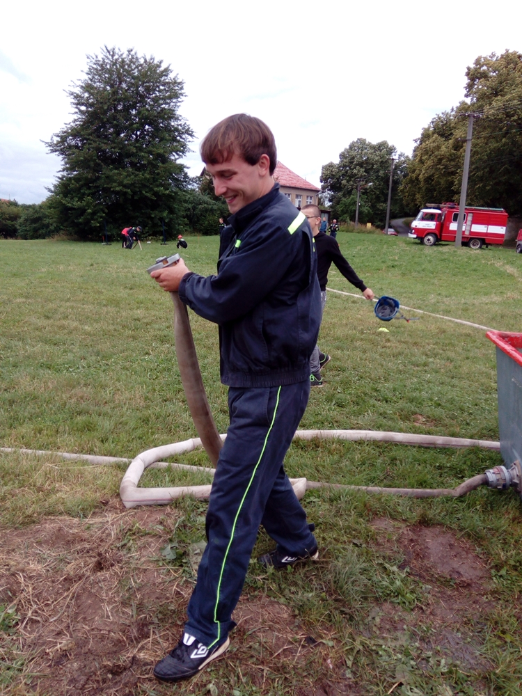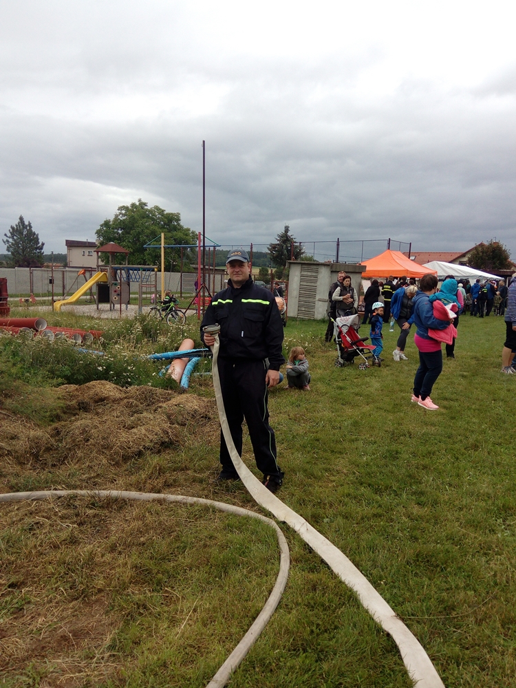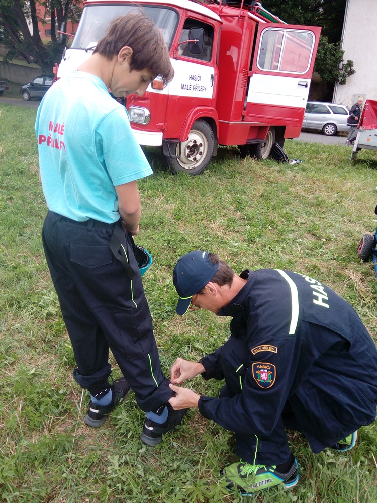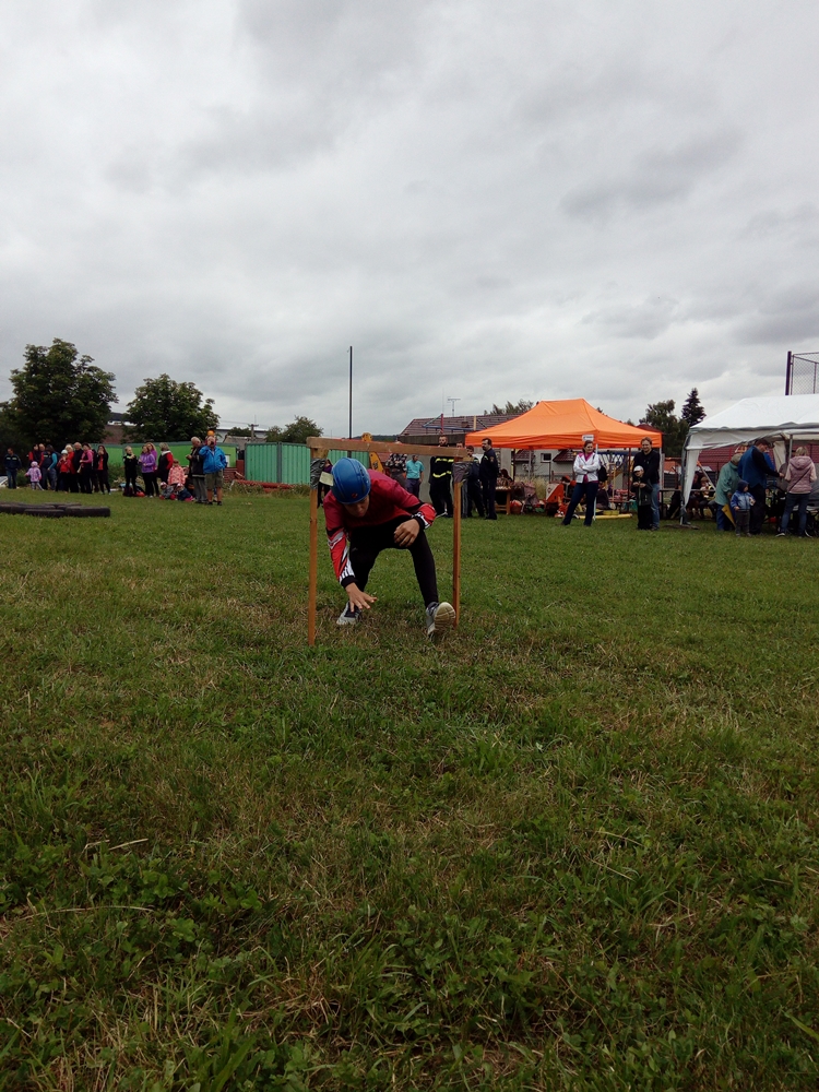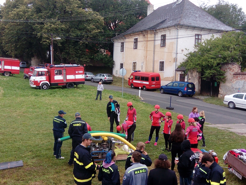 Štafeta se skládala ze čtyřech úseků, kdy první dva závodníci proběhnou s hasícím přístrojem slalomovou trať a podlezou laťku. Další závodník pak postaví barel, nabere do kbelíku vodu, proběhne překážku z pneumatik a podleze laťku. Poslední závodník podleze laťku, proběhne překážku z pneumatik a vodou z kbelíku by měl shodit barel. :-)