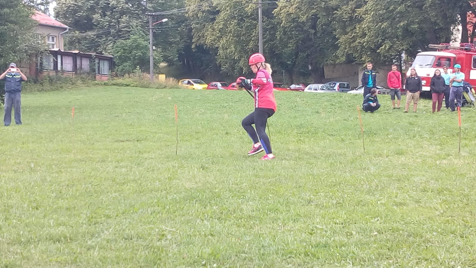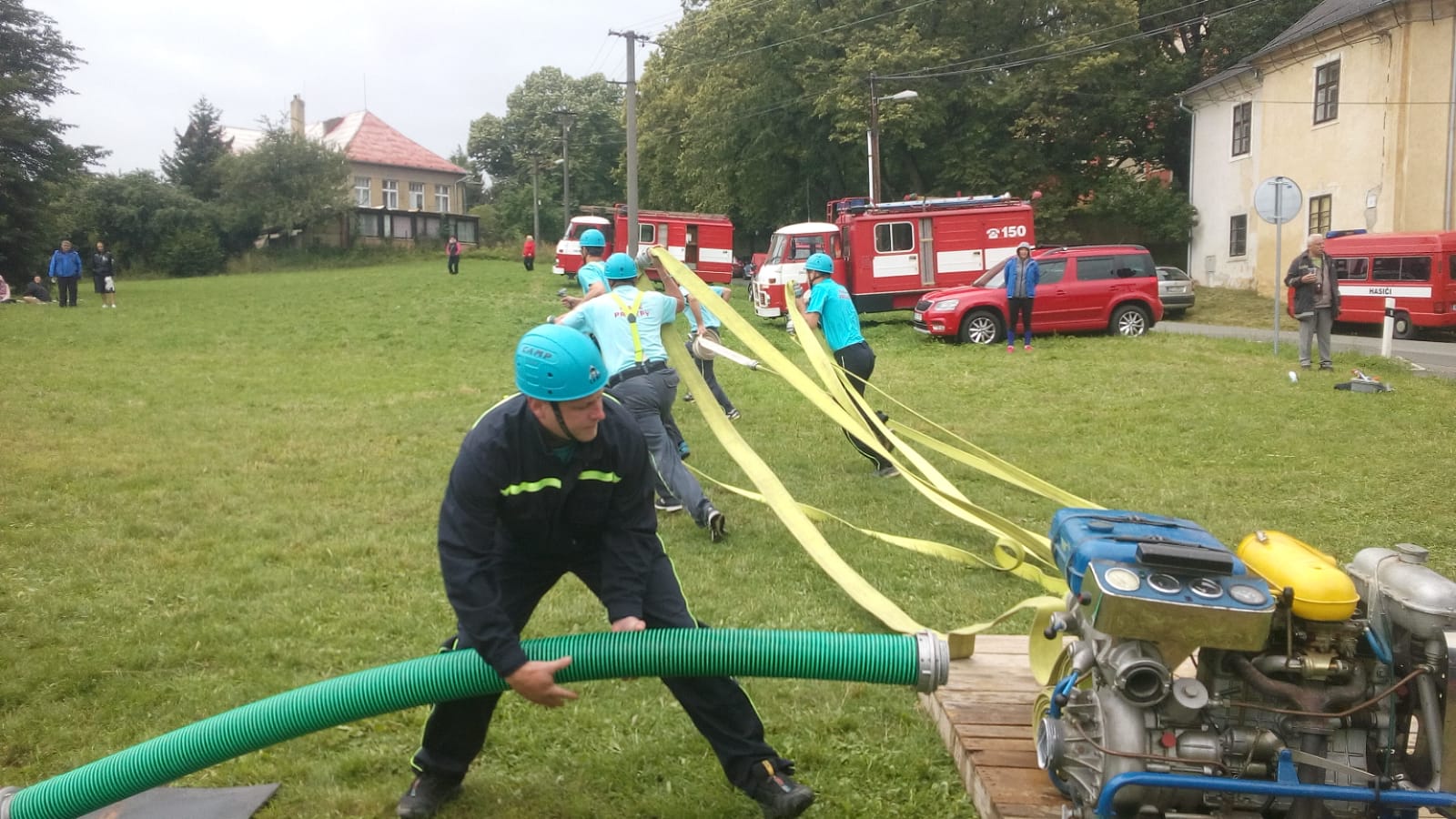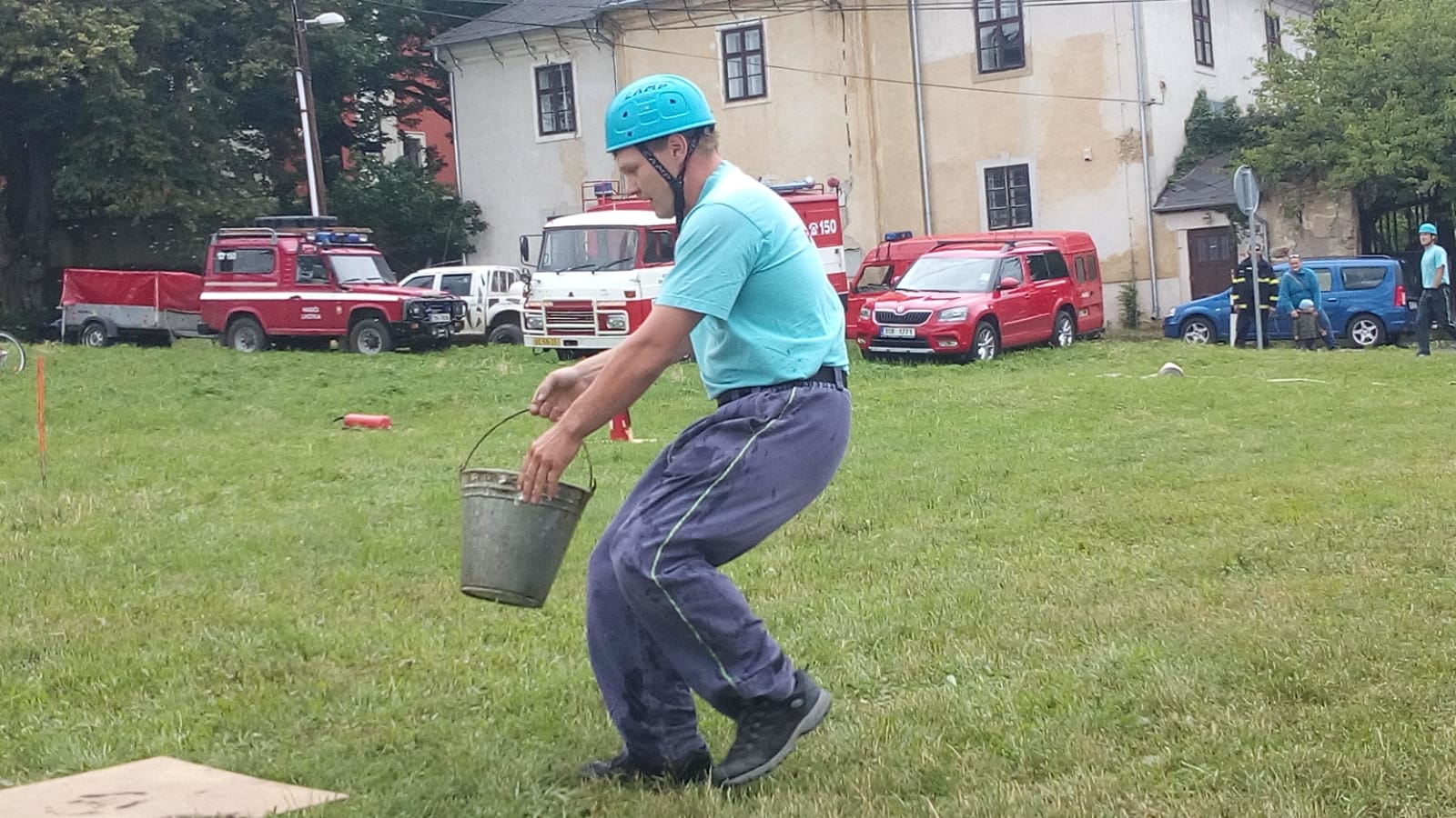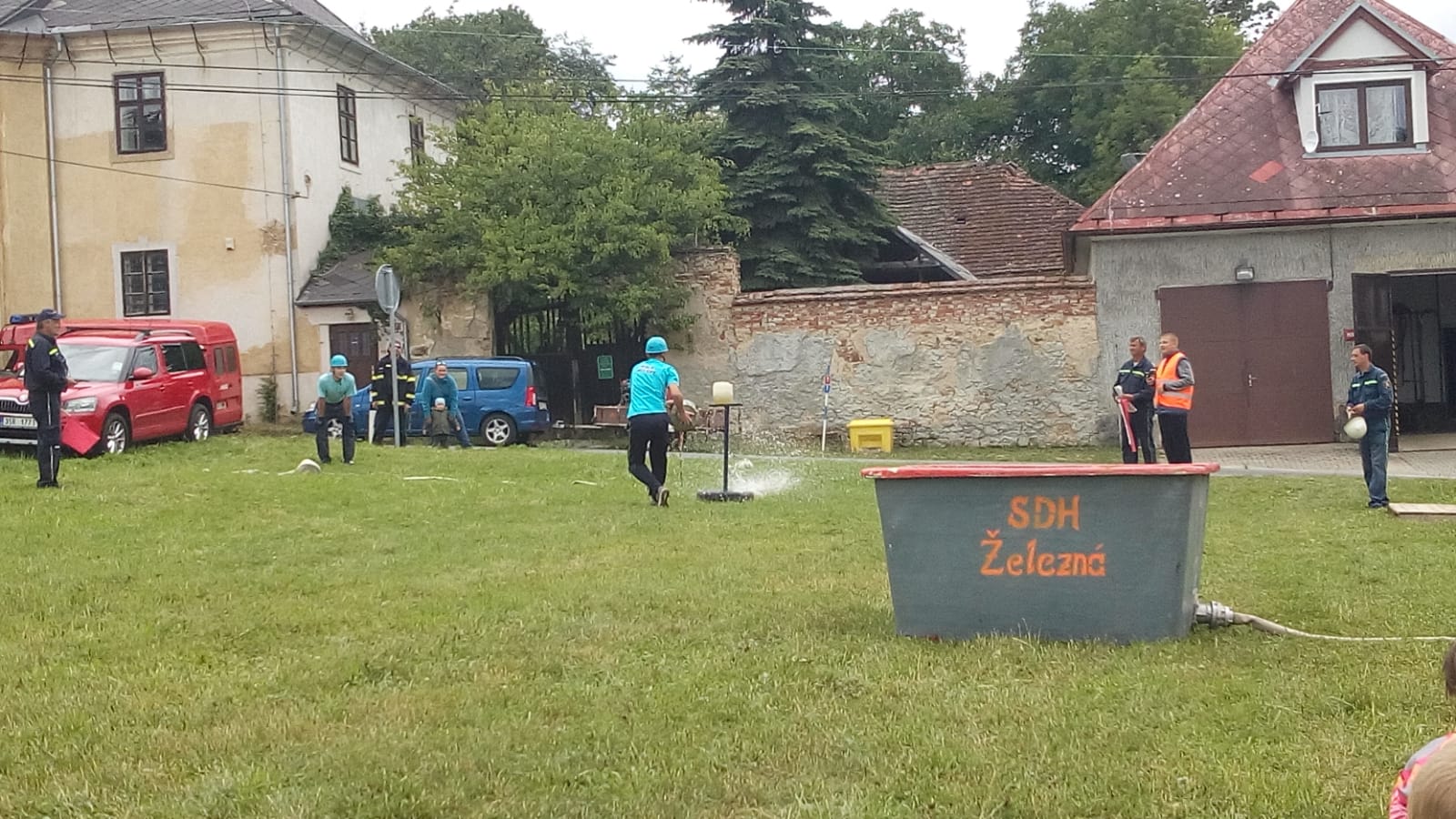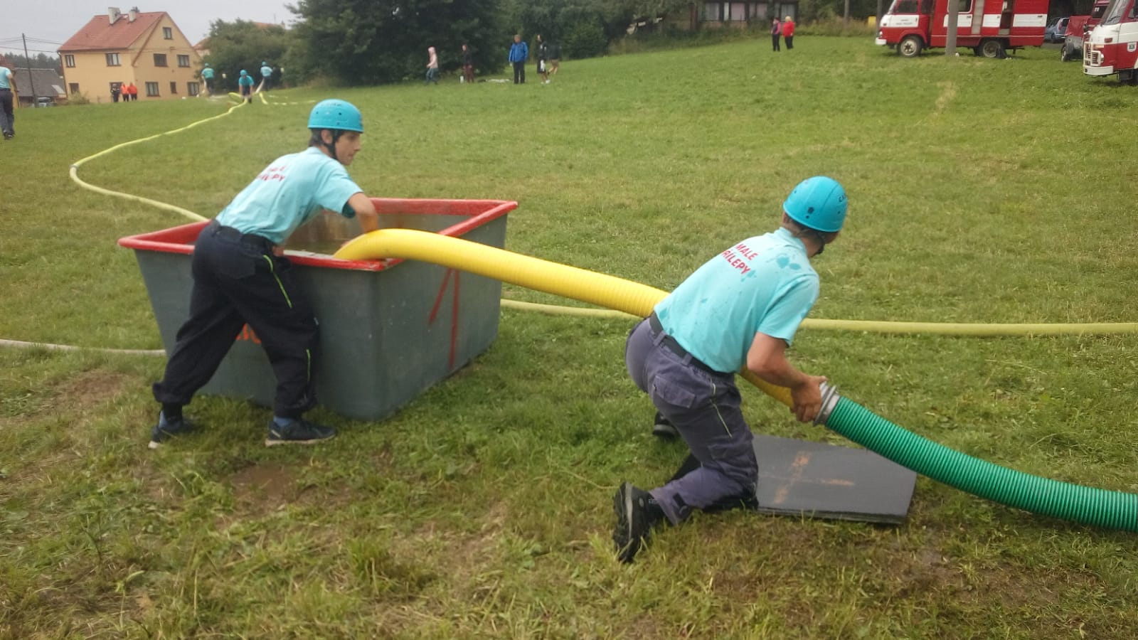 Štafeta se skládala ze čtyřech úseků, kdy první dva závodníci proběhnou s hasícím přístrojem slalomovou trať a podlezou laťku. Další závodník pak postaví barel, nabere do kbelíku vodu, proběhne překážku z pneumatik a podleze laťku. Poslední závodník podleze laťku, proběhne překážku z pneumatik a vodou z kbelíku by měl shodit barel. :-)