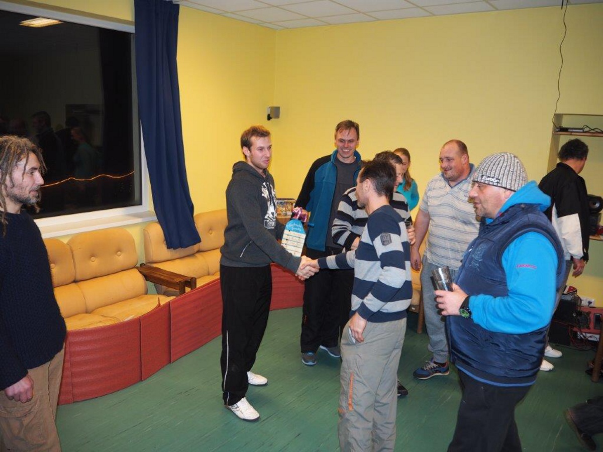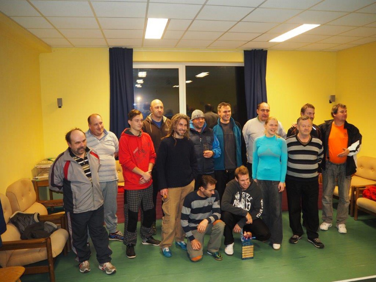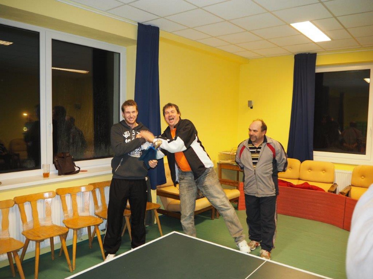 Sešel se neuvěřitelný počet šestnácti hráčů (včetně jedné Veroniky), kteří se přesně vešli do vyřazovacího pavouka. Nejlepším z vypadlých v první kole, a tedy vítězem Turnaje lůzrů, se k radosti všech přítomných stal sám ředitel haly - Honza Hřebík. Upřímně gratulujeme! Celkovým vítězem a držitelem putovního poháru je Kuba Špaček, který tím narušil tradici závěrečného ceremoniálu a předal po loňském vítězství pohár sám sobě. Byl to zase jednou celkově veselý, sportovně společenský podvečer. I díky excelentnímu výkonu Petra Čáníka, který nesmečoval, ale úspěšně čepoval. Díky za účast i zkušeným fanouškům. Silvestrovským smečům zdar a ať žije Velikonoční turnaj pořádaný samotným ředitelem haly!