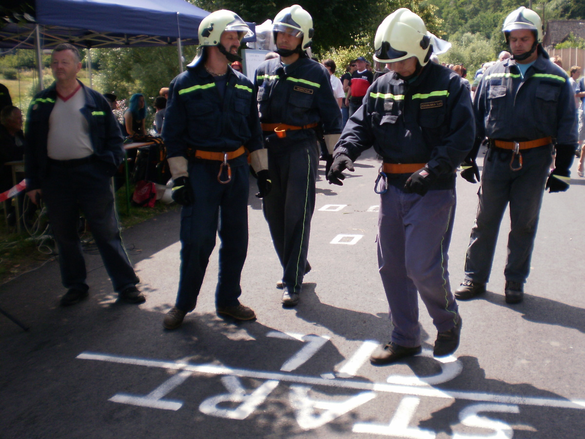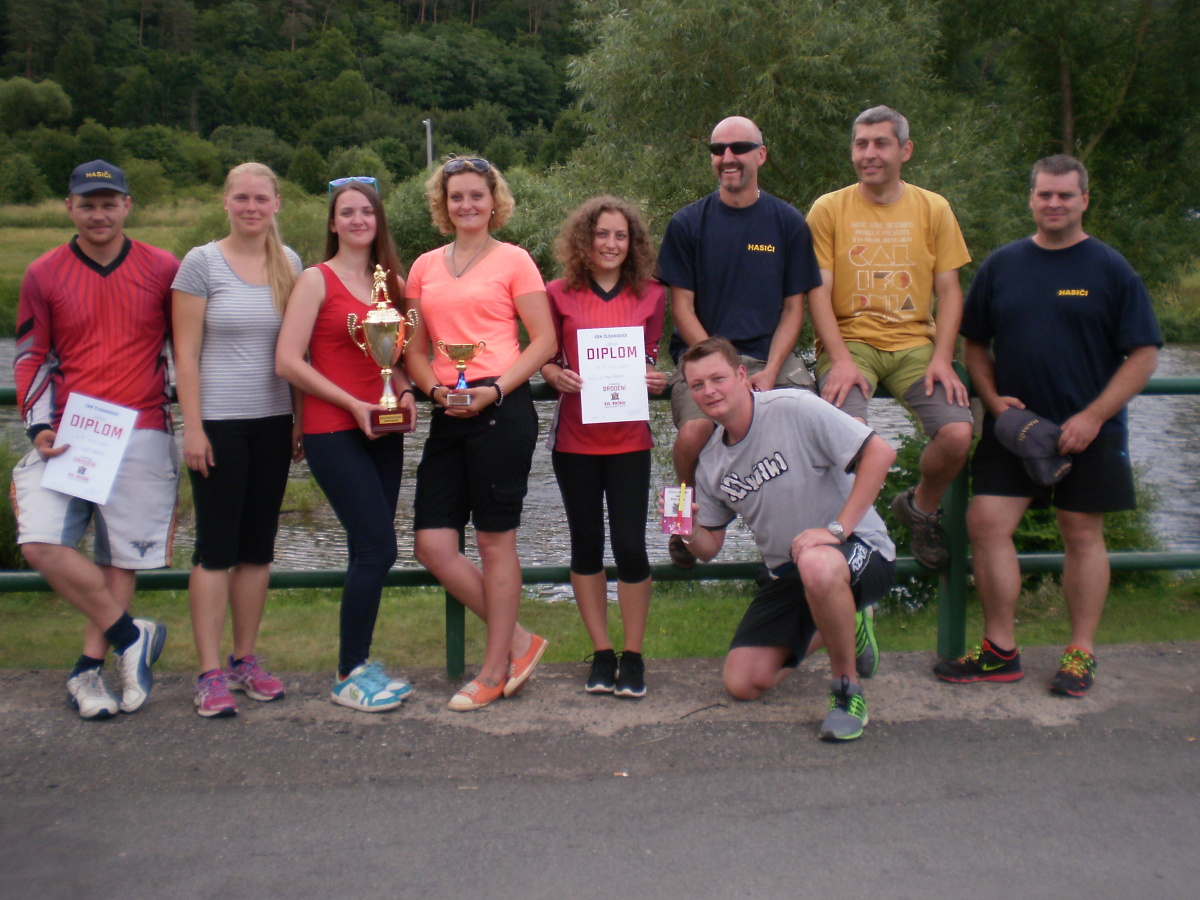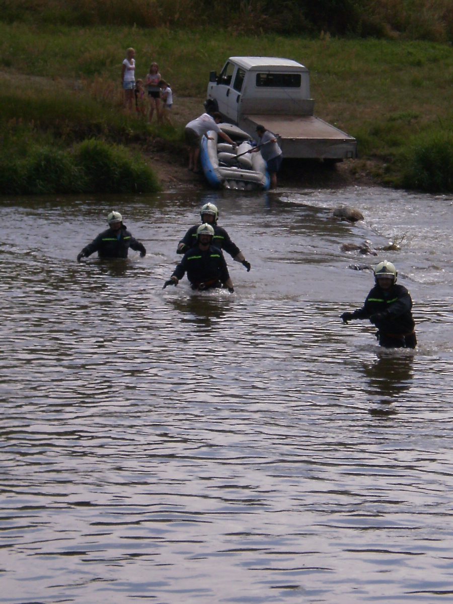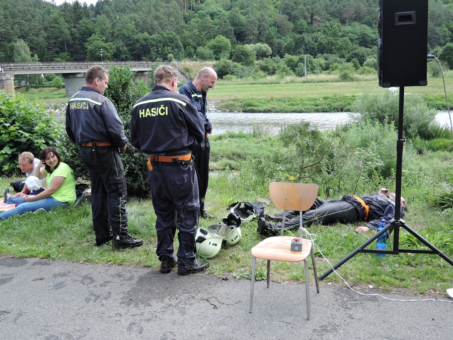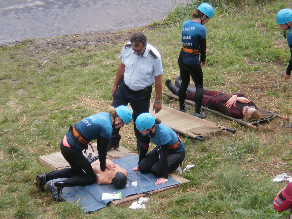 První z našeho sboru nastoupili na start muži. Slanění z mostu proběhlo dobře, jízda na raftu se také celkem podařila. Ale málem minuli lano, přejeli barel a proud je strhával. Nicméně zabojovali, udrželi raft proti proudu a barel vyzvedli jen taktak. U zdravovědy nebylo co vytknout. Kýble už byli opravdu dno sil, přesto je muži zvládli a za obrovské podpory fanoušků doběhli do cíle. Výsledkem bylo 6. místo s časem 11:59 min. Za ženské družstvo běžely Káťa a Verča tuto soutěž úplně prvně. Nicméně se nenechaly zaskočit. Všechny čtyři zvládly slanění velmi dobře. Zaváhaly však při jízdě na raftu, kde se pro oko diváka dvakrát ladně otočily, aby následně vyzvedly barel a spěchaly na vylodění. Brodění na druhý břeh nebylo, kvůli silnému proudu, vůbec příjemné. U zdravovědy musely holky více zaklonit hlavu figuríny, aby správně provedly umělé dýchání. Následovaly kýble a opět doběh do cíle s nosítky a fanoušky za zády. Holky vybojovaly 1. místo, čas 11:27 min.