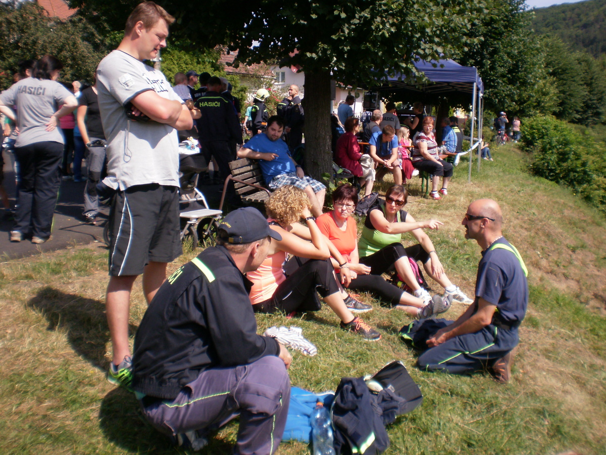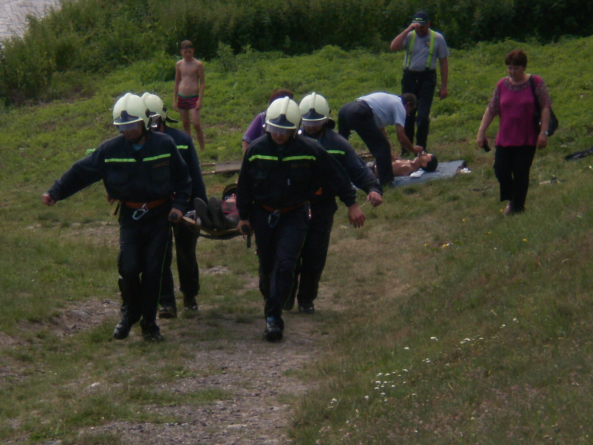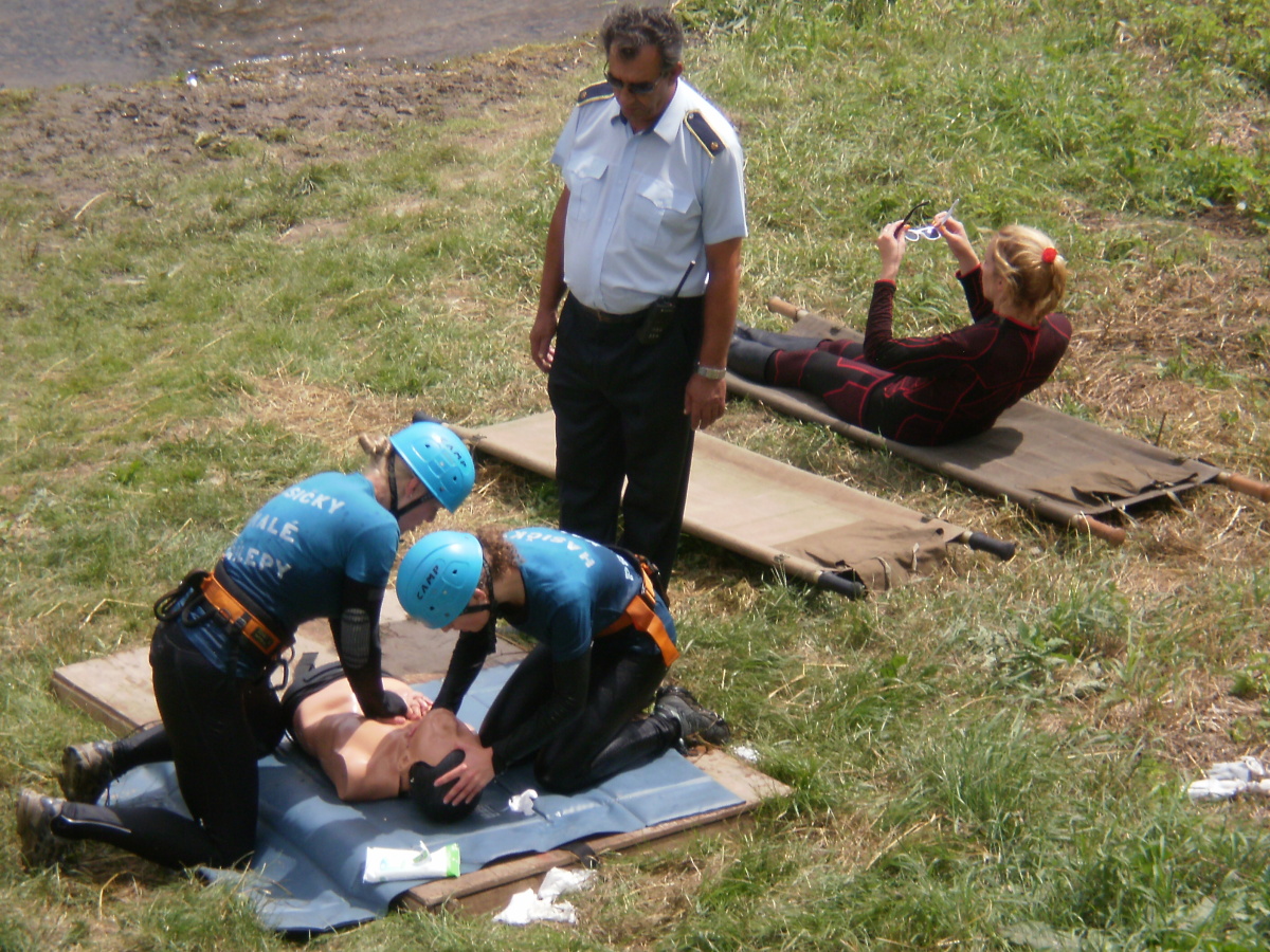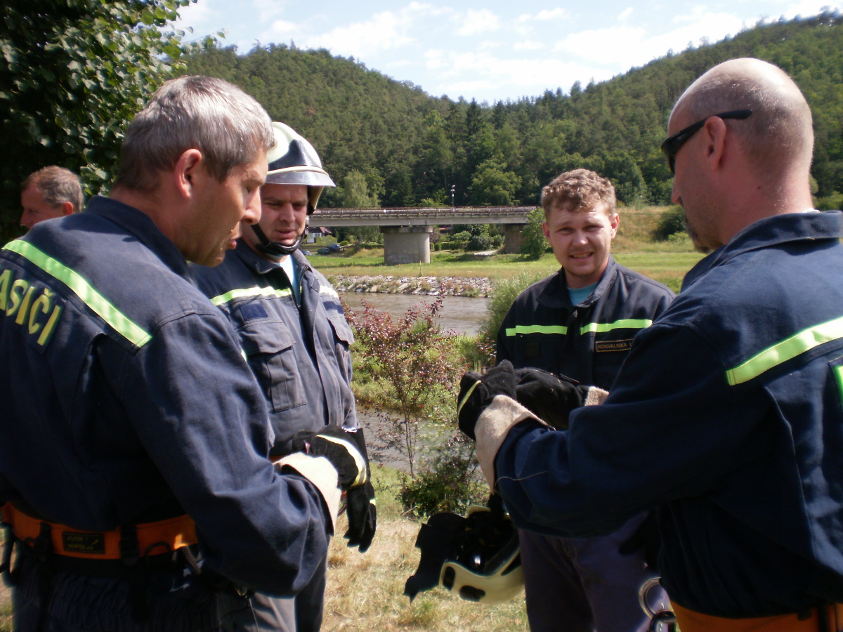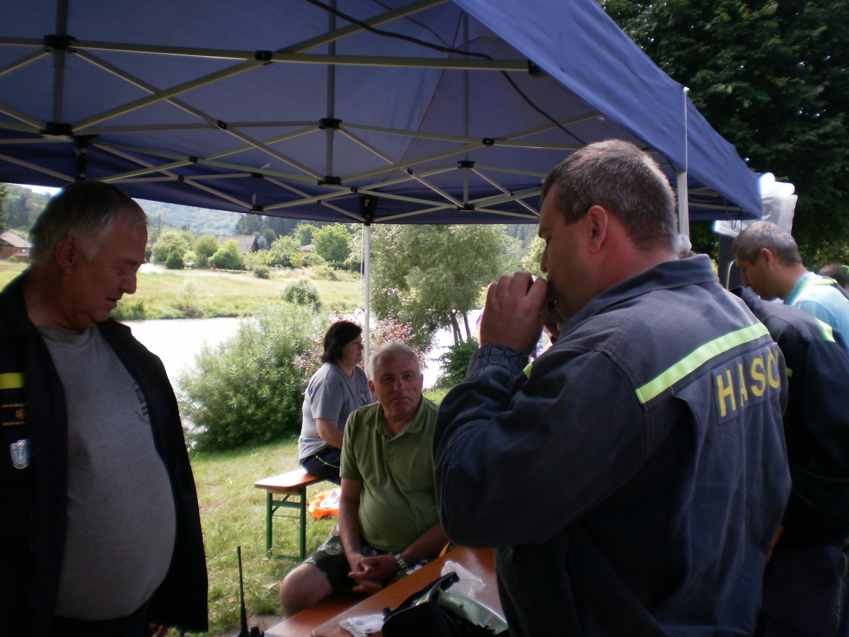 První z našeho sboru nastoupili na start muži. Slanění z mostu proběhlo dobře, jízda na raftu se také celkem podařila. Ale málem minuli lano, přejeli barel a proud je strhával. Nicméně zabojovali, udrželi raft proti proudu a barel vyzvedli jen taktak. U zdravovědy nebylo co vytknout. Kýble už byli opravdu dno sil, přesto je muži zvládli a za obrovské podpory fanoušků doběhli do cíle. Výsledkem bylo 6. místo s časem 11:59 min. Za ženské družstvo běžely Káťa a Verča tuto soutěž úplně prvně. Nicméně se nenechaly zaskočit. Všechny čtyři zvládly slanění velmi dobře. Zaváhaly však při jízdě na raftu, kde se pro oko diváka dvakrát ladně otočily, aby následně vyzvedly barel a spěchaly na vylodění. Brodění na druhý břeh nebylo, kvůli silnému proudu, vůbec příjemné. U zdravovědy musely holky více zaklonit hlavu figuríny, aby správně provedly umělé dýchání. Následovaly kýble a opět doběh do cíle s nosítky a fanoušky za zády. Holky vybojovaly 1. místo, čas 11:27 min.